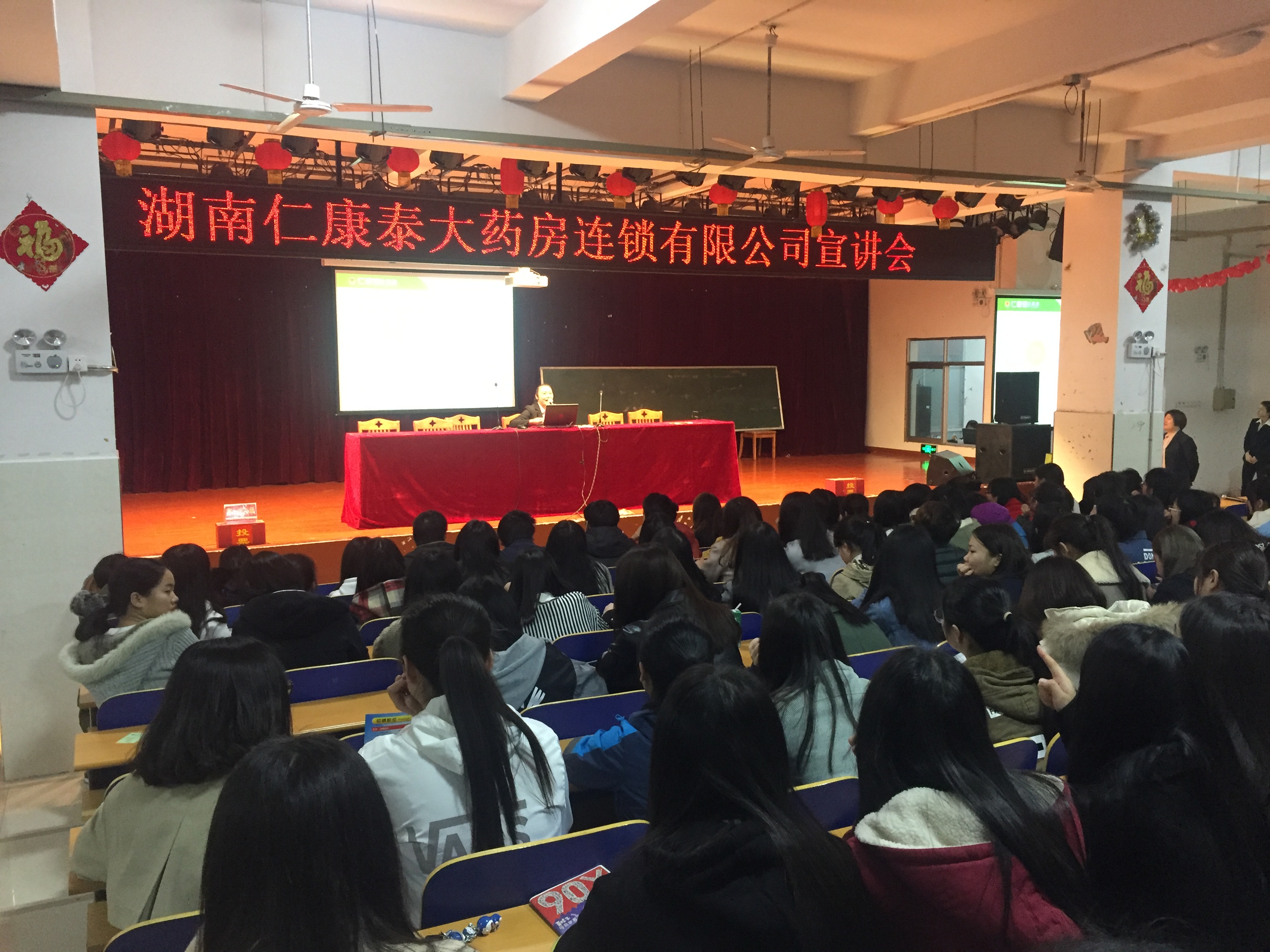 湖南仁康泰大药房创建于2002年7月,是星沙经开区第一家实现药品平价销售及首批通过GSP认证的药房,经过不断的发展与沉淀,目前专业连锁药店近200家,员工600余人。2017年已成立投资总公司,下属湖南仁康泰大药房连锁有限公司、湖南康运达医药有限公司、湖南悦养双宜健康产业发展有限公司三家分公司,实现企业 “连锁化、集成化、规模化”的持续发展。此次在我院举行宣讲会,提供医药销售员、合作事业专业、药店营业员等多个岗位实习生的招聘。