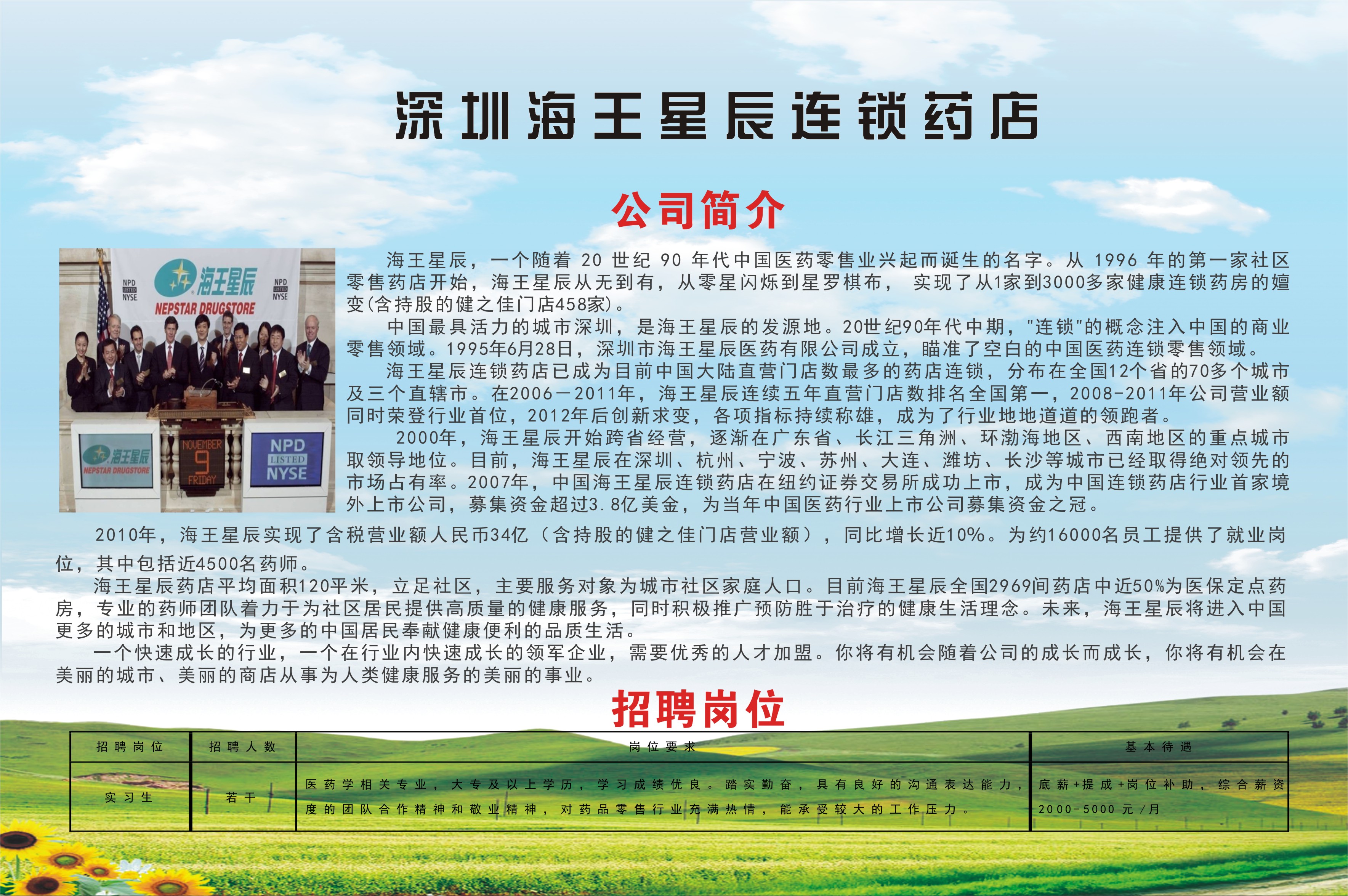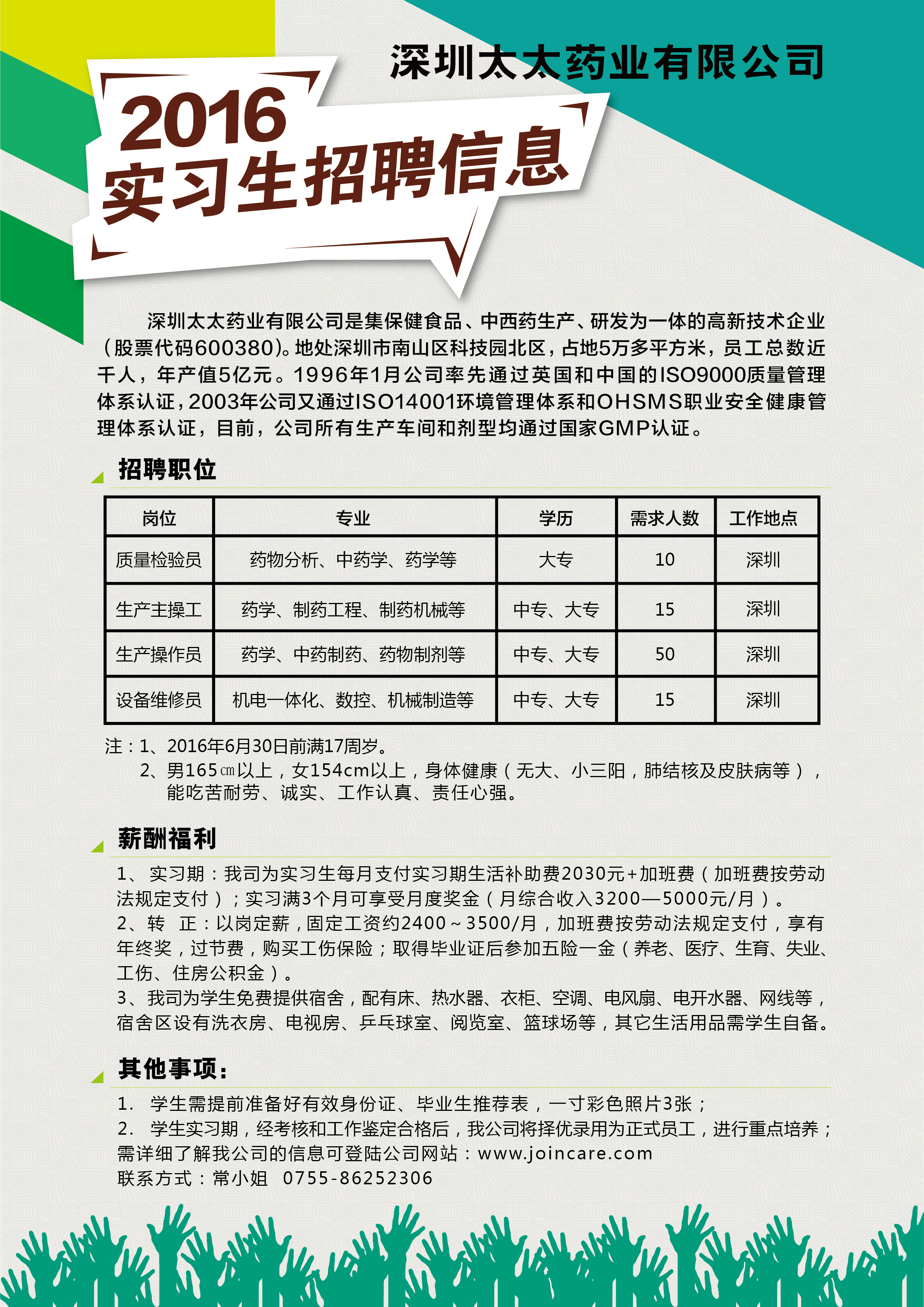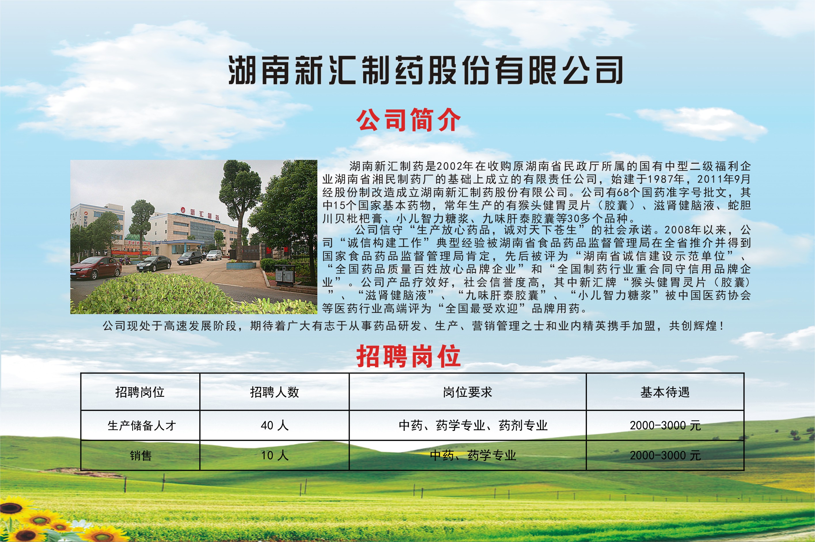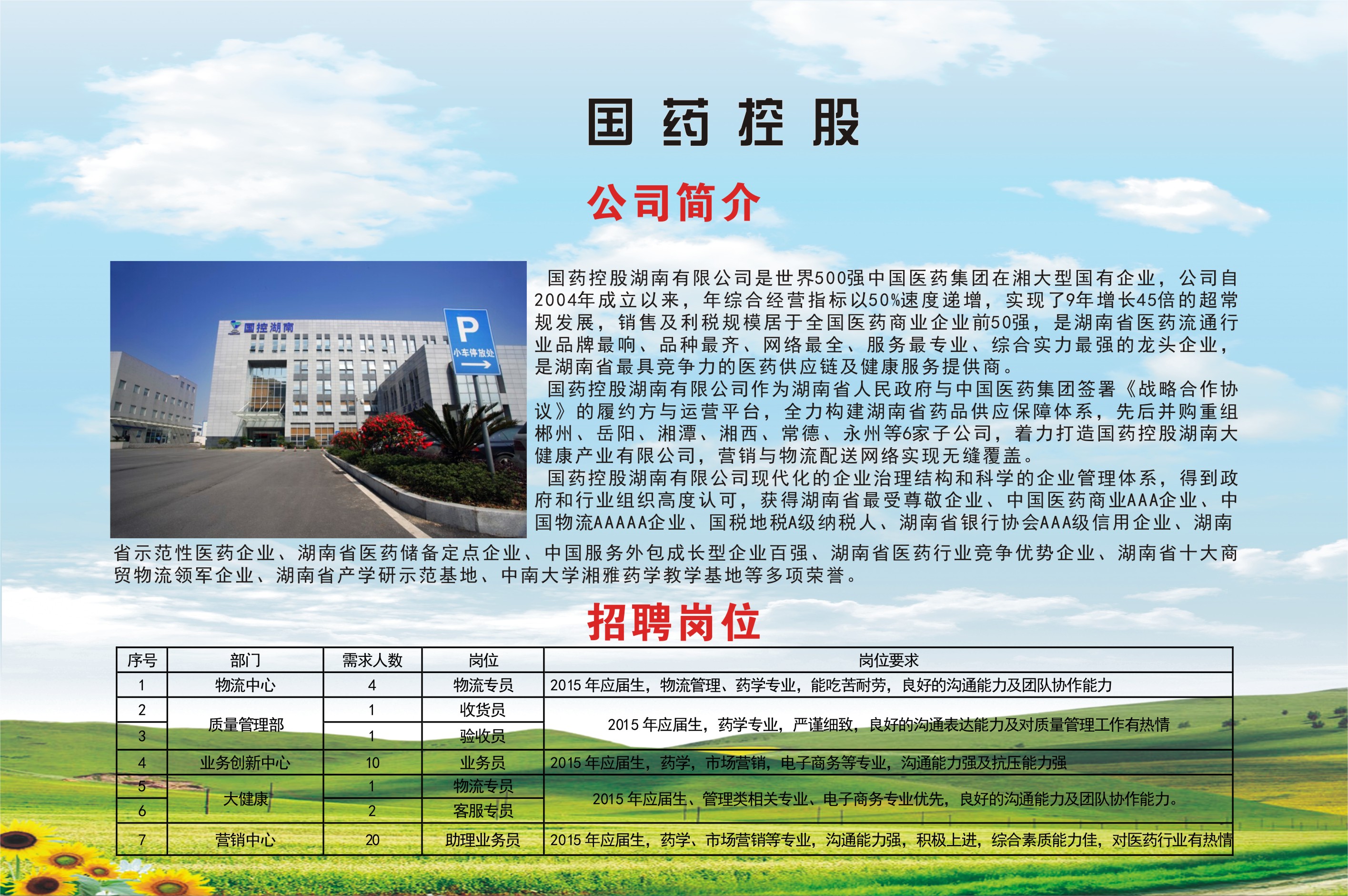 2016年校园招聘会参会企业宣传(第一批) 返回列表 发布日期: 2016-01-20 作者: 资料来源: 2016年校园招聘会参会企业宣传(第一批) (下列企业排名顺序不分先后) 省外企业 1 百洋医药科技有限公司(上海) 2 浙江为诚集团(杭州) 3 珠海丽珠集团丽珠制药厂 4 珠海联邦制药有限公司 5 珠海健帆生物科技股份有限公司 6 深圳市海王药业有限公司 7 深圳海王星辰健康药房连锁有限公司 8 深圳津村药业有限公司 9 深圳立健药业有限公司 10 深圳市海滨制药有限公司 11 深圳太太药业有限公司 12 深圳市一德堂医药有限公司 13 康乐保(中国)有限公司 14 国药控股国大药房(深圳一致)连锁有限公司 15 深圳康泰生物制品股份有限公司 省内企业 1 老百姓大药房连锁(湖南)有限公司 2 湖南科源医疗器械销售有限公司 3 湖南海王星辰健康药房连锁有限公司 4 湖南至尚药业有限公司 5 湖南汉森制药股份有限公司 6 湖南怀仁药业有限公司 7 国药控股湖南有限公司 8 湖南千金湘江药业股份有限公司 9 九芝堂股份有限公司 10 康普药业股份有限公司 11 湖南永康堂大药房连锁有限公司 12 湖南同健大药房连锁股份有限公司 13 天士力医药营销集团有限公司 14 湖南天地恒一医药有限公司 15 北京同仁堂长沙分公司 16 湖南和舟医药有限公司 17 特格尔集团医药股份有限公司(芝林大药房) 18 湖南康寿药业有限公司 19 湖南养天和大药房企业集团有限公司 20 湖南中和制药有限公司 21 长沙普济生物科技有限公司 22 湖南千金大药房连锁有限公司 23 湖南新汇制药股份有限公司 24 湖南仁康泰大药房 25 益丰大药房 上一条转发全国就业指导中心《关于开展2016年度全国高校创新创业总结宣传工作的通知》 下一条省就业指导中心颁发首张“多证合一、一照一码”营业执照(转载)