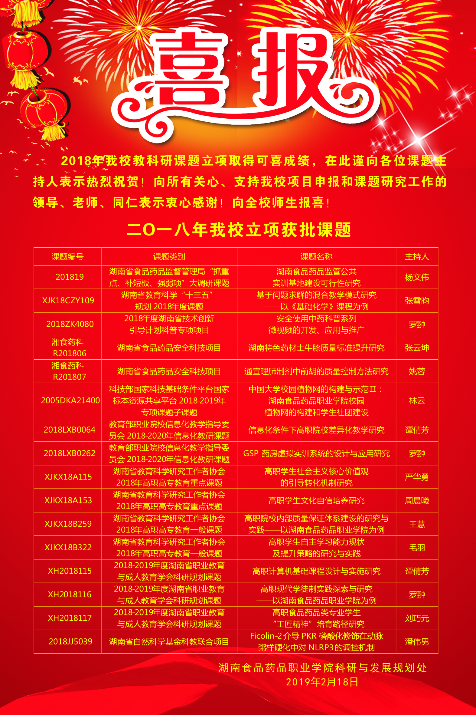 在各级领导的关心、各部门的支持及全校教师的努力下,2018年我校教科研课题项目立项取得可喜成绩,获批各级各类教科研课题项目16项,包括:湖南省教育科学“十三五”规划课题1项;湖南省自然科学基金科教联合项目1项;湖南省技术创新引导计划科普专项1项;科技部国家科技基础条件平台国家标本资源共享平台2018-2019年专项课题子课题1项;湖南省食品药品监督管理局“抓重点、补短板、强弱项”大调研课题1项;湖南省食品药品安全科技项目2项;教育部职业院校信息化教学指导委员会2018-2020年信息化教学研究课题2项;湖南省教育科学研究工作者协会2018年高职高专教育重点课题2项、一般课题2项;2018-2019年度湖南省职业教育与成人教育学会科研规划课题3项。