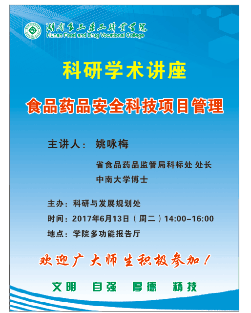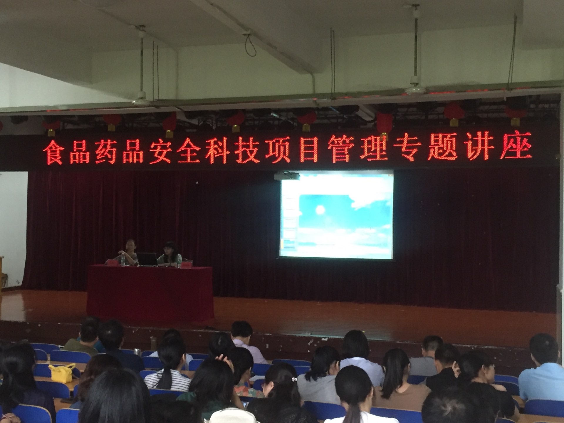 为了进一步加强我校学科建设和师资队伍建设,进一步提升广大教师的科研意识和创新能力,我校于6月13日下午举办了科研学术专题讲座。本次讲座特别邀请了湖南省食品药品监督管理局科技标准处姚咏梅处长主讲,主题为“食品药品安全科技项目管理”,由甘湘宁副校长主持,全体教职工参加了本次讲座。