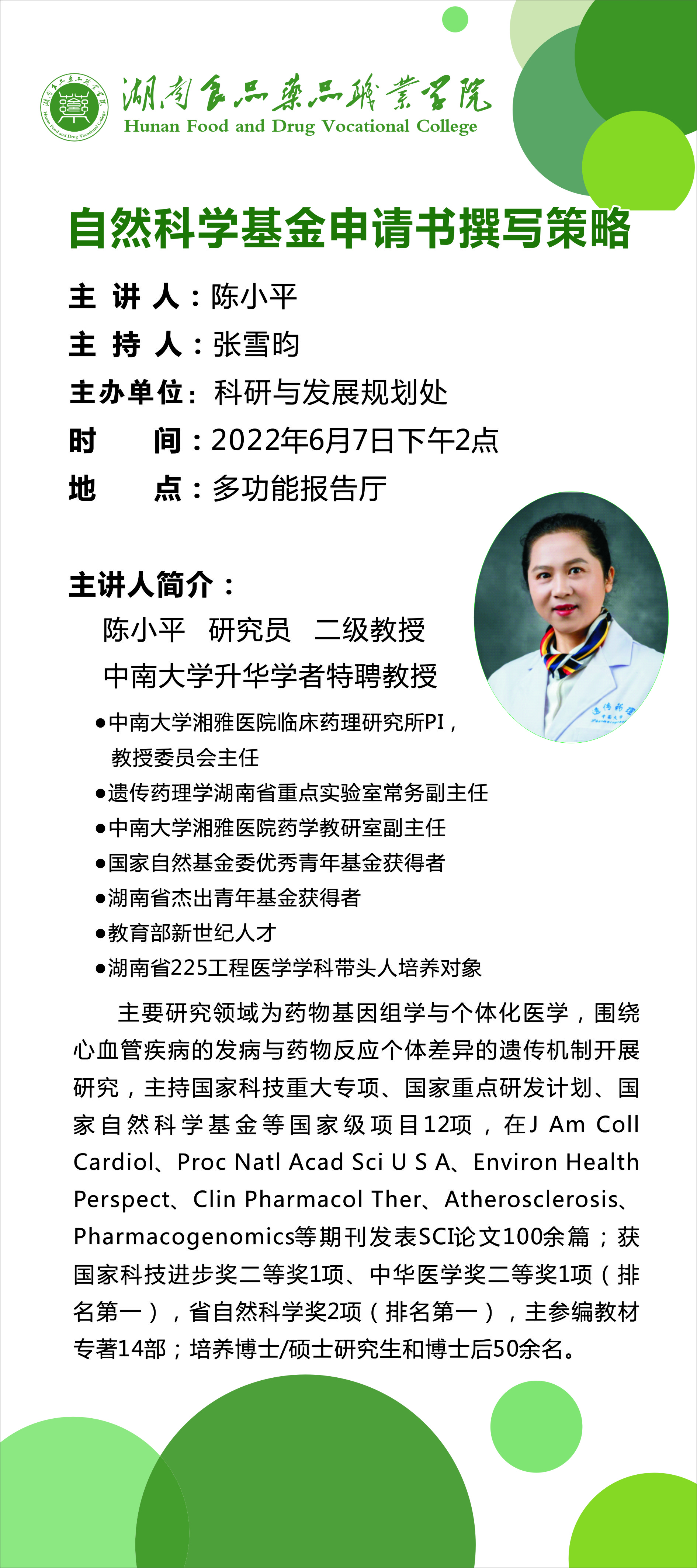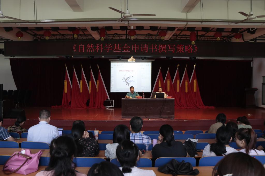 为有效推动我校高层次项目申报,提高自然科学基金项目申报质量,提升教师科研能力与水平,6月7日下午,中南大学“升华学者”特聘教授、中南大学湘雅医院临床药理研究所PI、遗传药理学湖南省重点实验室常务副主任、博士生导师陈小平教授应邀来我校作《自然科学基金申请书撰写策略》专题讲座。党委委员、副校长张雪昀教授主持讲座,全体专兼职教师和专业技术人员现场聆听。