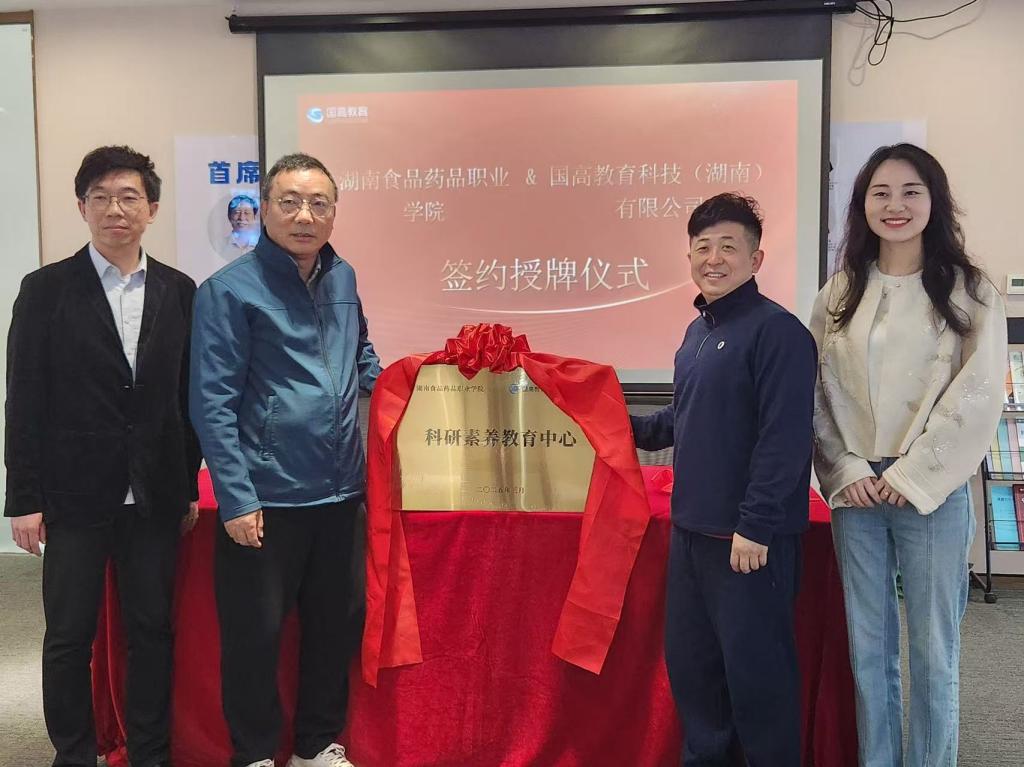 3月25日上午,我校与国高教育科技(湖南)有限公司战略合作签约暨“科研素养教育中心”揭牌仪式在新湖南大厦隆重举行。湖南食品药品职业学院党委委员、副校长张雪昀,科研与发展规划处处长潘伟男,公司总经理匡文明、长沙区域总监吴沁怡等出席仪式。
