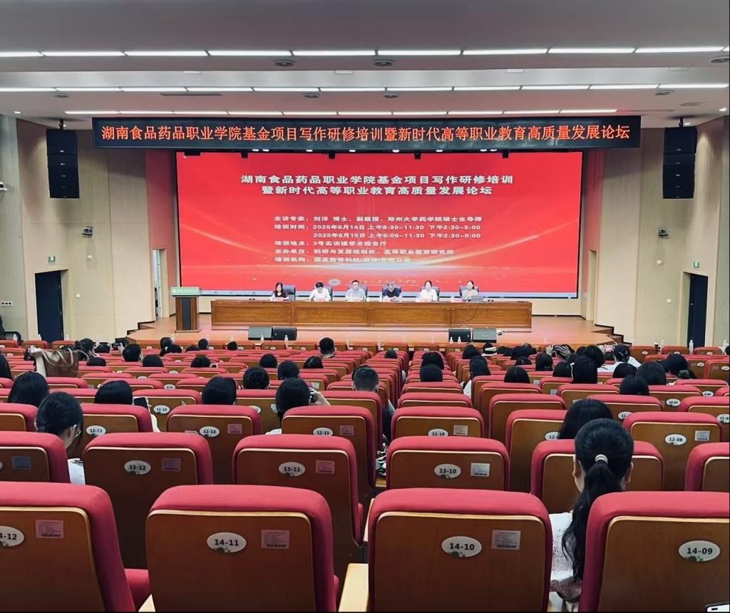 6月14日至15日,我校在3号报告厅举办基金项目写作研修培训暨新时代高等职业教育高质量发展论坛。学校党委委员、副校长欧健,国高教育科技(湖南)有限公司资深专家姚新良、长沙区域总监吴沁怡,郑州大学药学院硕士生导师刘洋等领导、专家出席,200余名专兼职教师和专业技术人员参加研修培训和论坛交流,开班仪式由科研与发展规划处处长潘伟男主持。