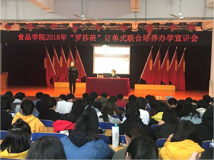 2018年3月13日下午长沙罗莎食品有限公司人事部主任在多功能报告厅举办了“罗莎班”订单式联合办学宣讲会。食品学院院长叶云华、副院长徐魏、学生管理干事伍婧、辅导员石晓玲、陈华秋、邓丹黎、欧阳丁及食品学院全体学生参加会议。