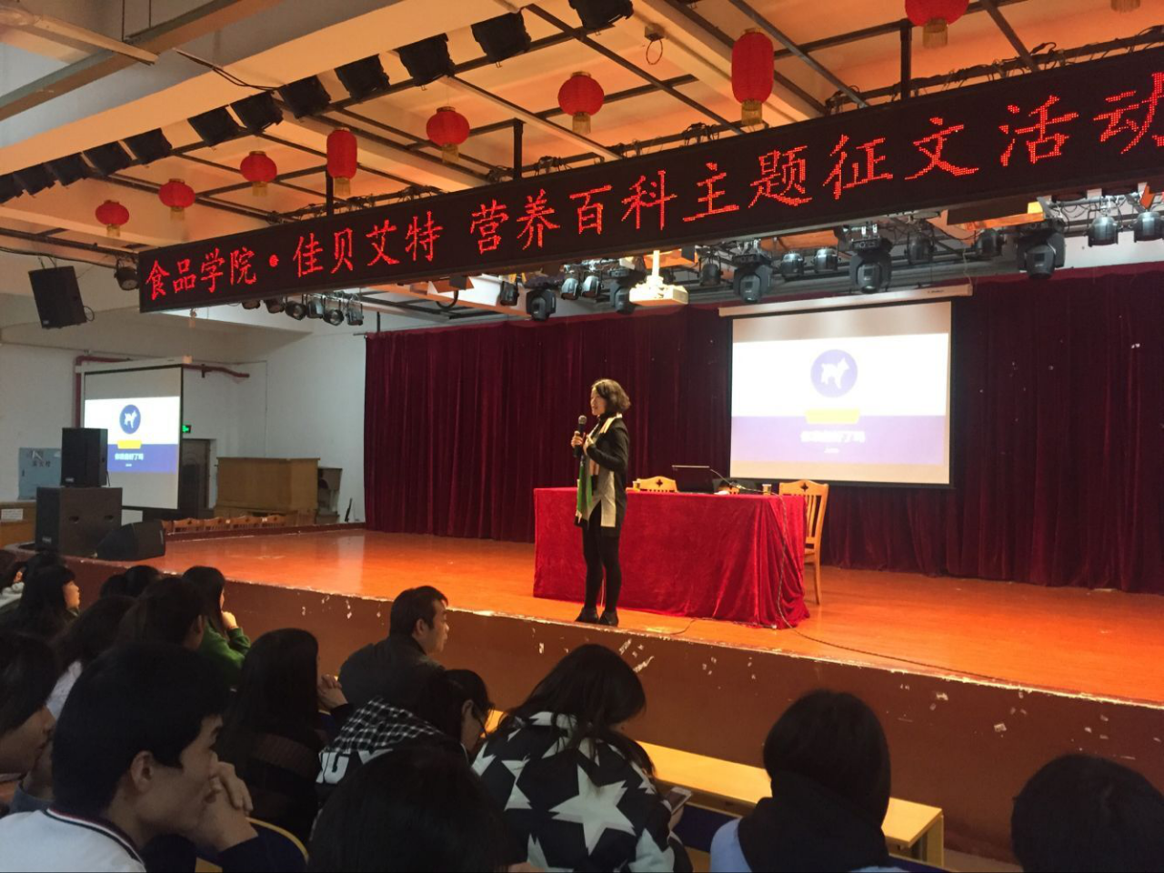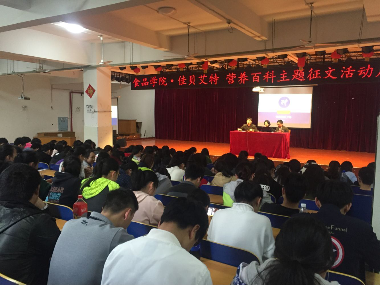 2017年3月27日,由食品学院和佳贝艾特共同举办的营养百科主题征文活动启动仪式在湖南食品药品学院多功能报告厅举行。佳贝艾特(中国)市场总监蒋慧、人事经理张西洋,食品学院副院长徐魏、教师伍婧和廖建兵及近200名学生出席了启动仪式。