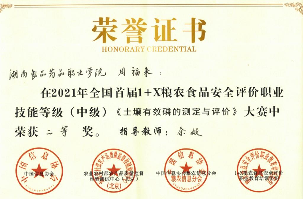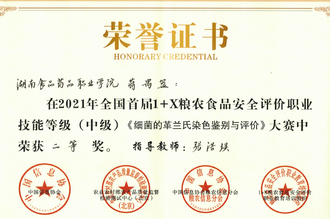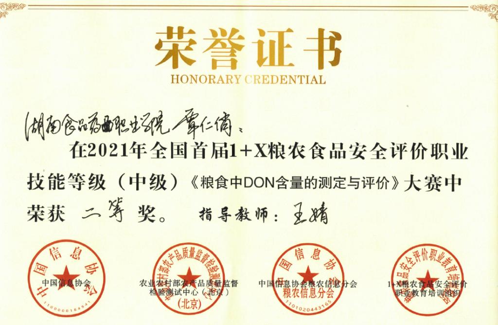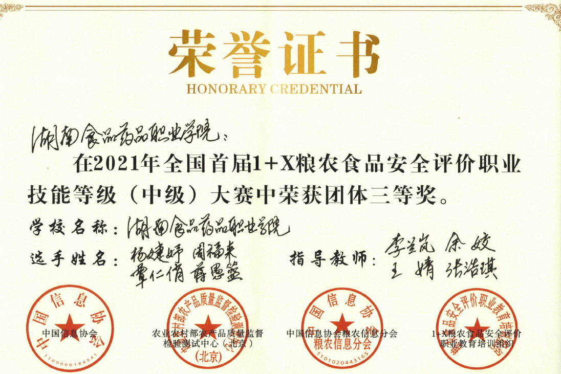 2021年6月24-26日全国首届1+X粮农食品安全评价职业技能等级(中级)大赛在漯河食品职业学院圆满落幕。我校荣获三个二等奖,一个优秀奖,一个团体三等奖,一个最佳优秀组织奖。