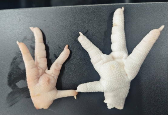对比结果触目惊心:漂白后的鸡爪色泽异常白亮、体积膨胀、表面光滑,原有的腐败气味被完全掩盖;而普通鸡爪则呈现自然的肉色。技术让隐患无处遁形,也让同学们深刻认识到食品安全问题的隐蔽性与危害性。
