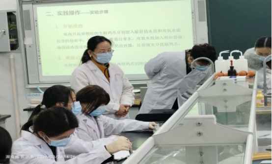 在实验室内,食品学院党总支戴书记与专业课教师共同指导学生,严格模拟不法商贩的操作方式:选取新鲜鸡爪,分别用双氧水制备漂白样品,并与普通鸡爪进行对照,直观还原食品安全问题的发生过程,引导学生从专业视角深入剖析问题本质。