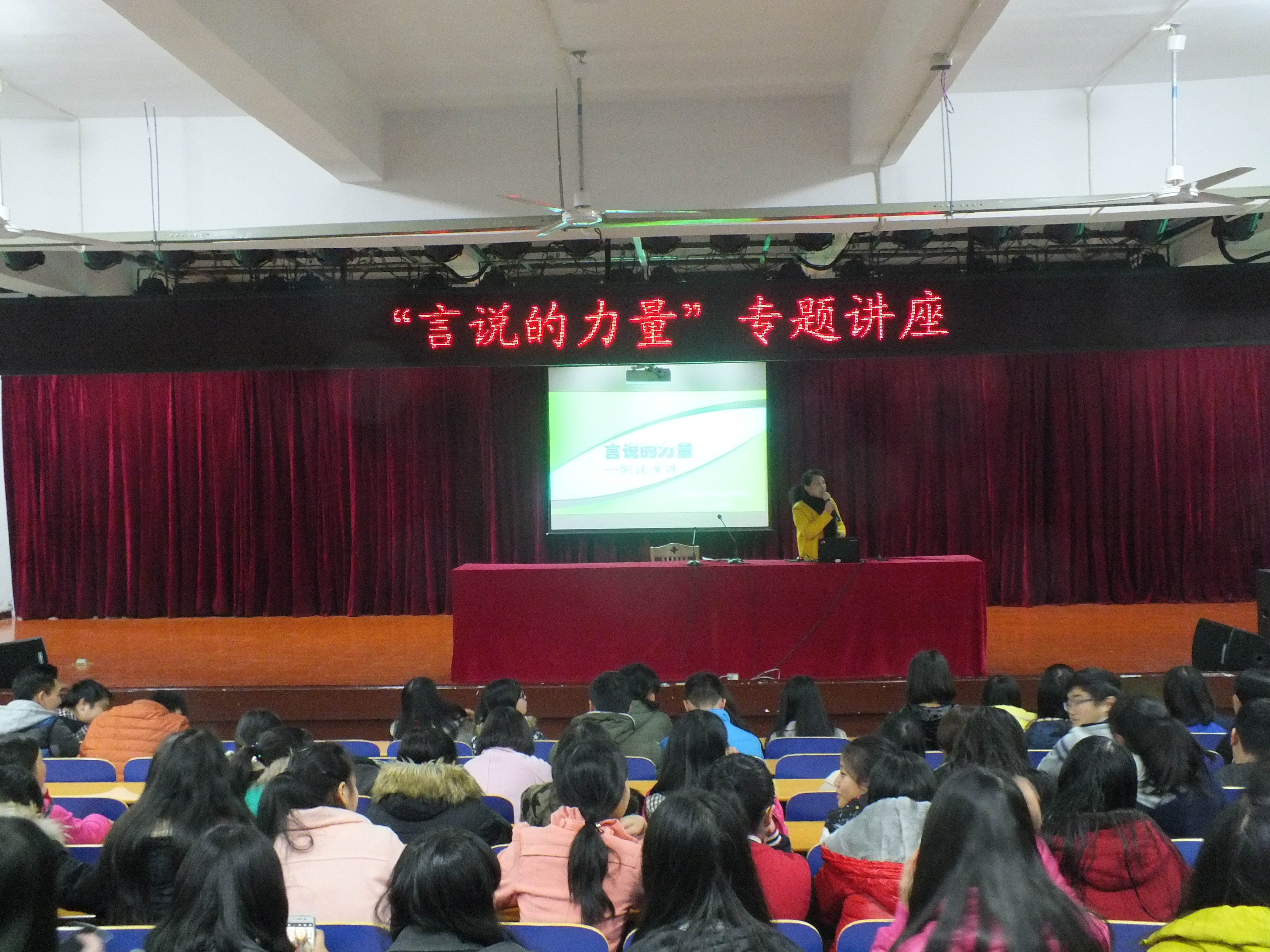 11月30日晚,拥有丰富教学经验的廖楚珍老师在学院小礼堂为同学们进行了一场题目为“言说的力量”的讲座。廖老师首先跟同学们进行了趣味横生的游戏互动,调动了大家的学习积极性,接着廖老师利用几个经典视频向我们讲解了“以理服人”、“以情感人”、“以趣迷人”、“以美动人”等言说必备的要素,并做出了详细的分析。廖老师超凡的言说才能及生动有趣的案例让我们感受到了言说的力量。