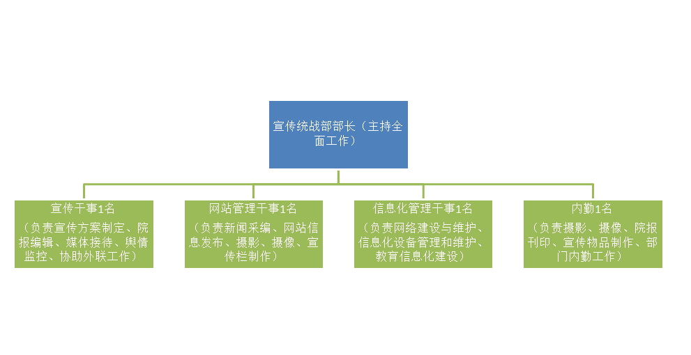学院宣传统战部是院党委的职能部门,全院思想、文化舆论的主管部门,负责学院政治宣传、思想教育、新闻舆论、对外宣传、校园文化建设、精神文明建设、网络基本建设及其维护、网站建设及管理、教育信息化建设等方面的工作;是贯彻执行中共中央关于统一战线方针、政策,向院党委反映情况,提出开展统战工作意见和建议的职能部门。