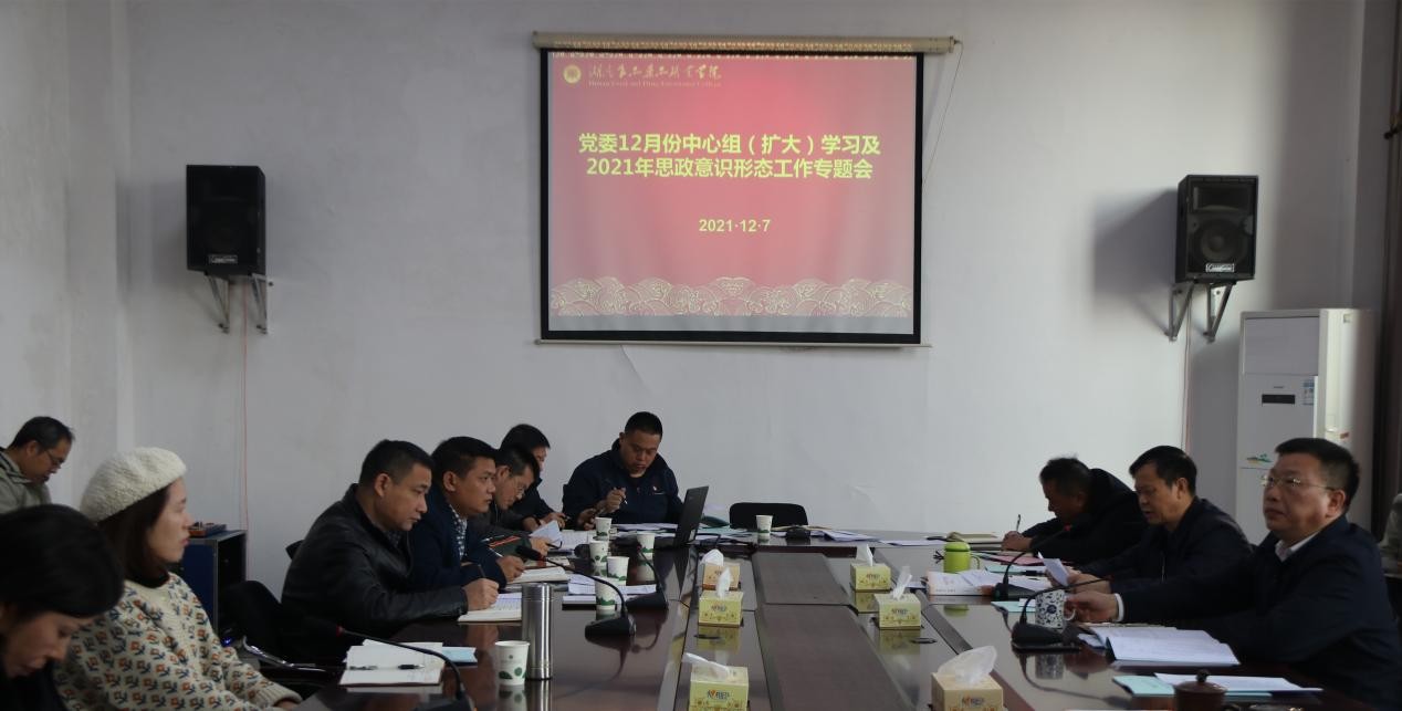 12月7日,我校召开党委12月份中心组(扩大)学习及2021年思政意识形态工作专题会议。党委班子成员,各党总支书记,各部门、二级学院负责人以及思政理论课教师、辅导员代表参加会议。会议由党委书记杨文伟主持。