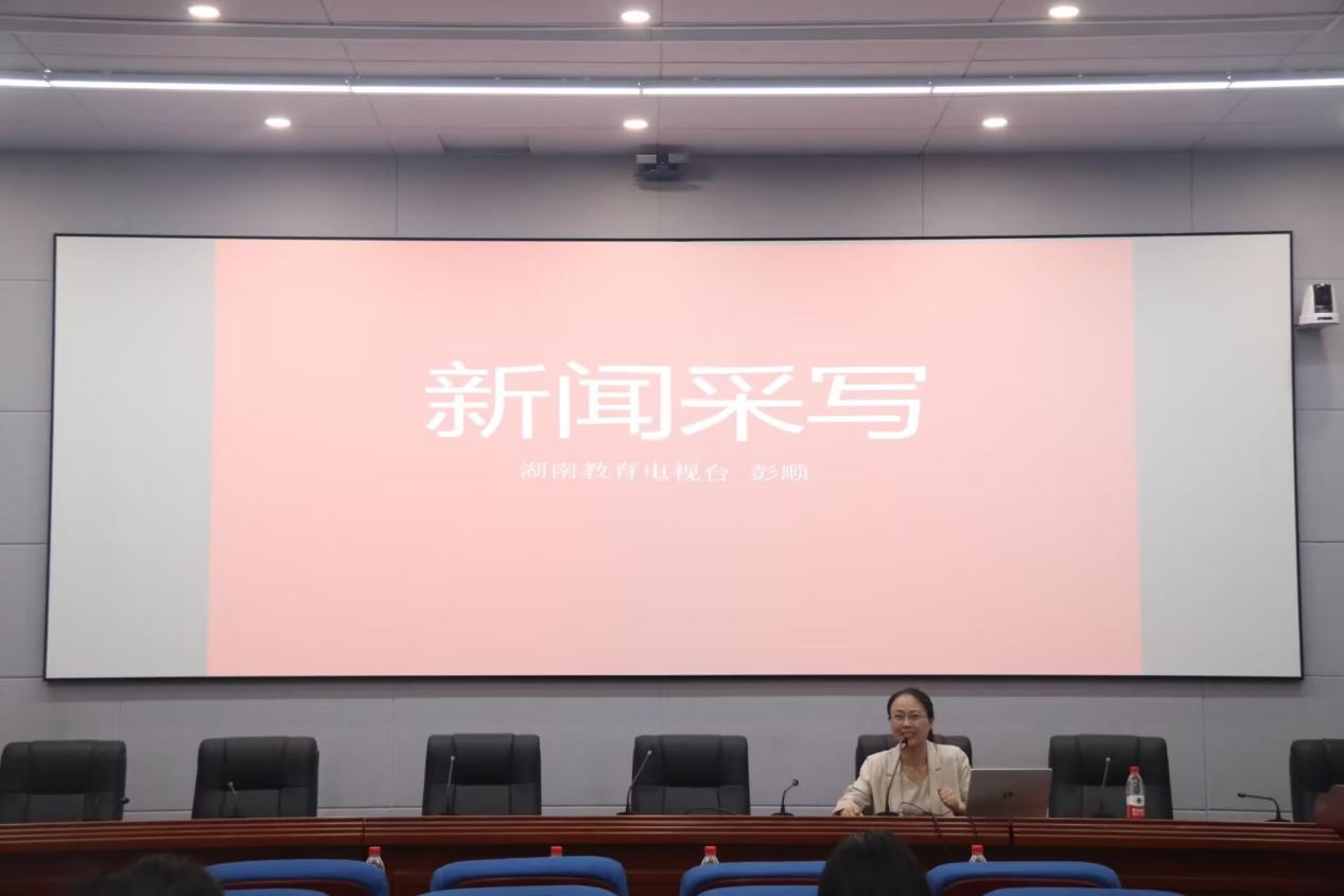 2023年5月25日,湖南教育电视台《湖南招考》栏目制片人,传播学硕士彭顺受邀来我校开展新闻采访与写作培训,各党总支宣传委员及大学生记者团、易班、新媒体成员代表参加培训。讲座由党委委员、宣传统战部部长欧健主持。