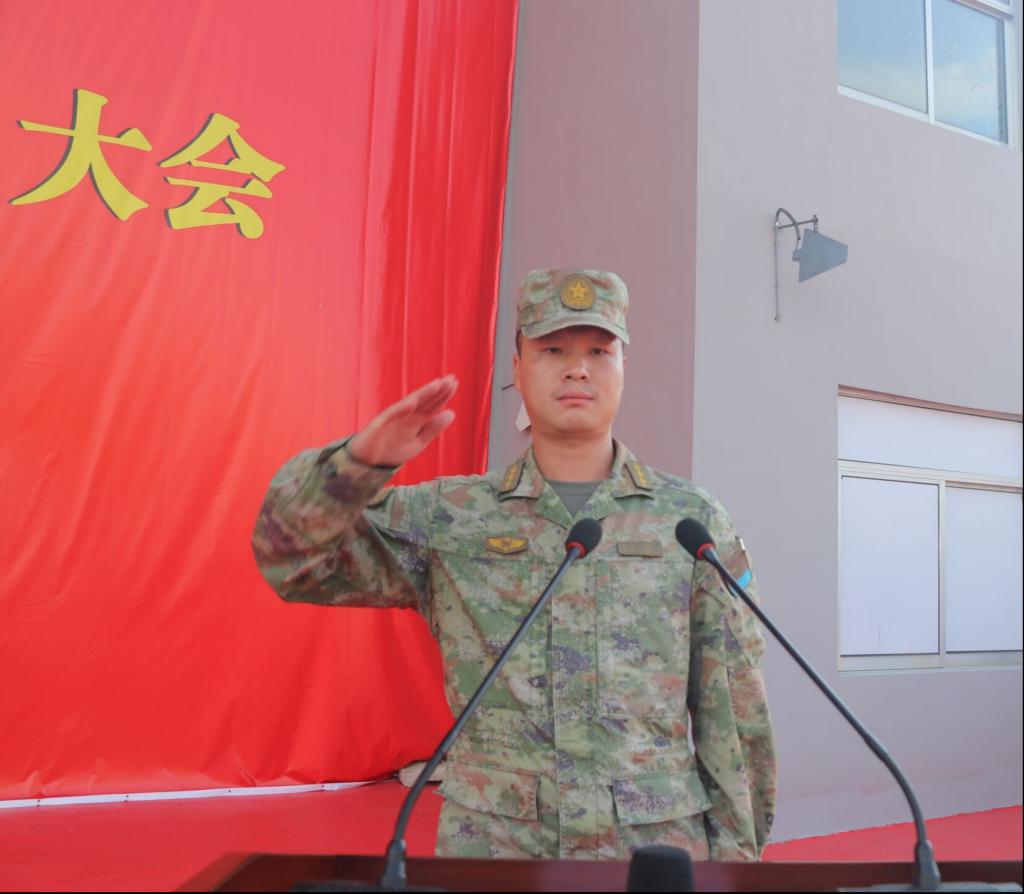 总教官方博作军训动员讲话,希望全体新生以军人的标准严格要求自己,发扬不怕苦、不怕累的精神,在训练中培养自律意识与团队协作能力,以饱满的热情、昂扬的斗志圆满完成军训任务。