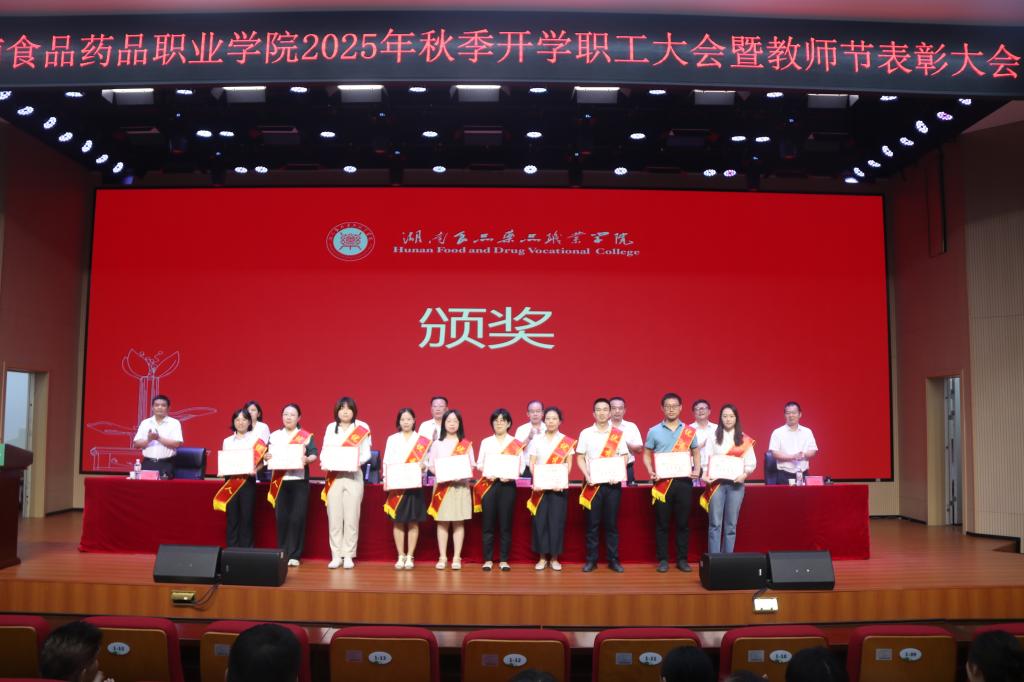 党委副书记吴猛宣读了湖南食品药品职业学院关于2024-2025学年优秀教师、优秀教育工作者的决定。李林、祝玲等17名同志获得“优秀教师”荣誉称号,曾丽红、刘福宝等3名同志获得“优秀教育工作者”荣誉称号。与会领导为获得以上荣誉的教师代表颁奖,以表彰他们在过去一年中在教育教学、管理服务等工作中作出的突出贡献,激励全体教职工以先进为标杆,坚守育人初心。