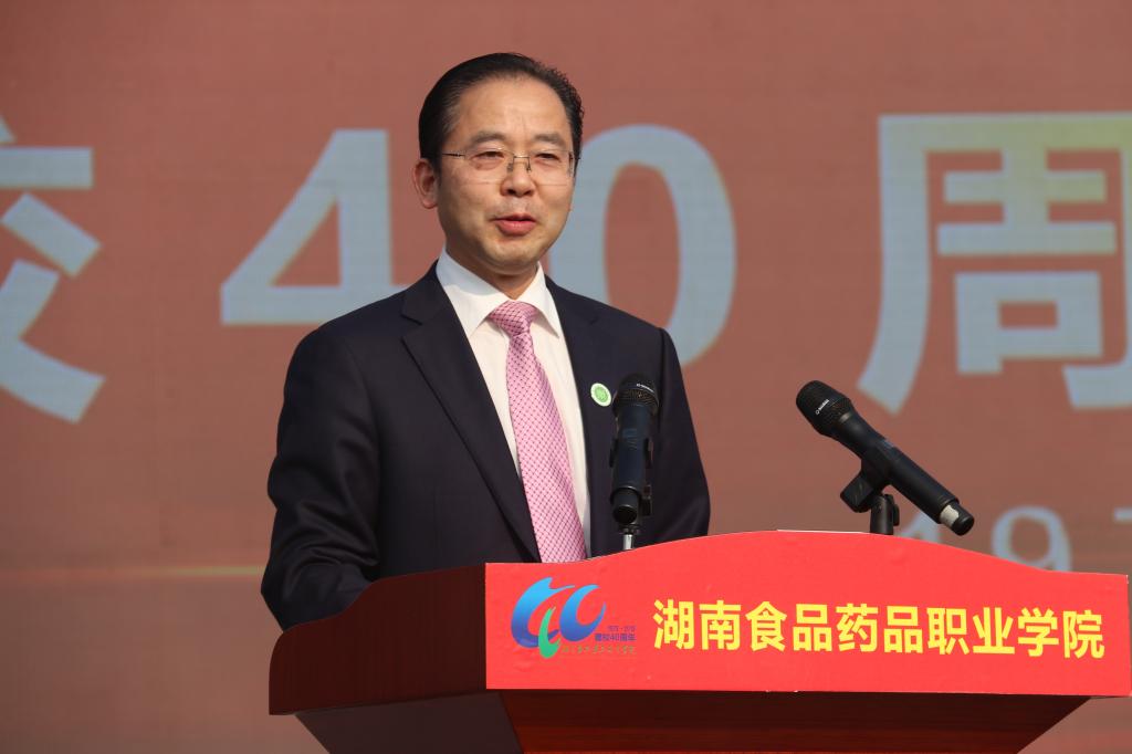 学校党委书记杨文伟首先代表学校全体师生员工,向拨冗光临的各位领导、嘉宾和专程返校的校友,表示热烈欢迎和衷心感谢。他与大家一起回顾了学校40载接力传承的办学历程,并指出,正是一代一代湘食药人坚守初心,追求卓越,始终坚持艰苦创业,自信自强,始终坚持遵循规律,科学发展,才取得今天的成就。我们将承前启后,继往开来,向改革要动力,向创新要活力,向和谐要合力,坚持内涵发展,彰显办学特色,以习近平新时代中国特色社会主义思想为指导,按照党的十九大确定的职业教育“产教融合、校企合作”发展要求,围绕“扩规模、提质量、上水平、增效益”工作思路,在上级领导和社会各界的大力支持下,在老领导老同志的理解支持下,在全校师生共同努力下,全面推动学校改革发展再上新台阶,为培育德技双馨的高素质技术技能人才,为行业产业健康发展,为建设富饶美丽幸福新湖南和中国特色社会主义做出新的更大贡献。