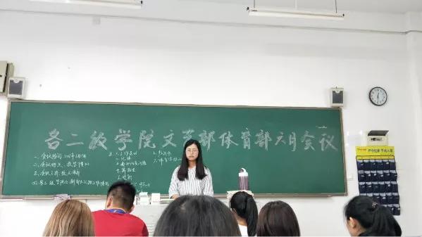 会议主要是跟各二级学院的部长们进行熟悉沟通,传达近期学校的相关活动安排,并由各二级学院部长上台汇报本部门的工作情况及工作中存在的问题和困难,会议气氛活跃融洽,大家对文体部的发展提出了许多意见及想法,李主席对二级学院文艺部、体育部汇报的工作给予肯定与支持。