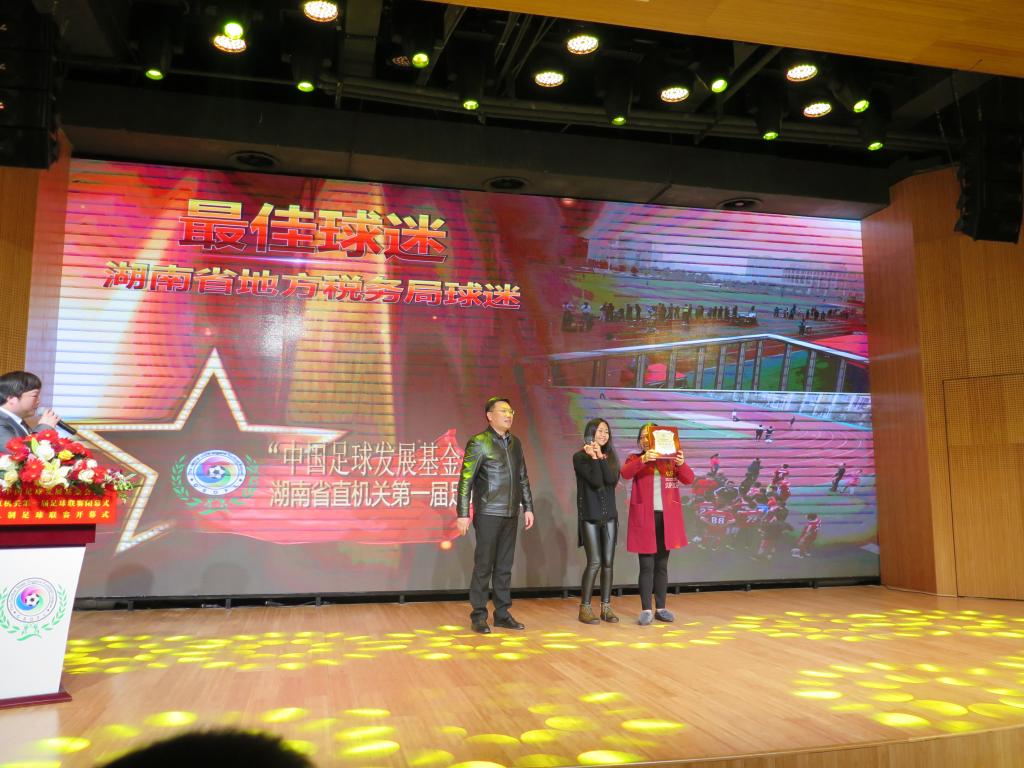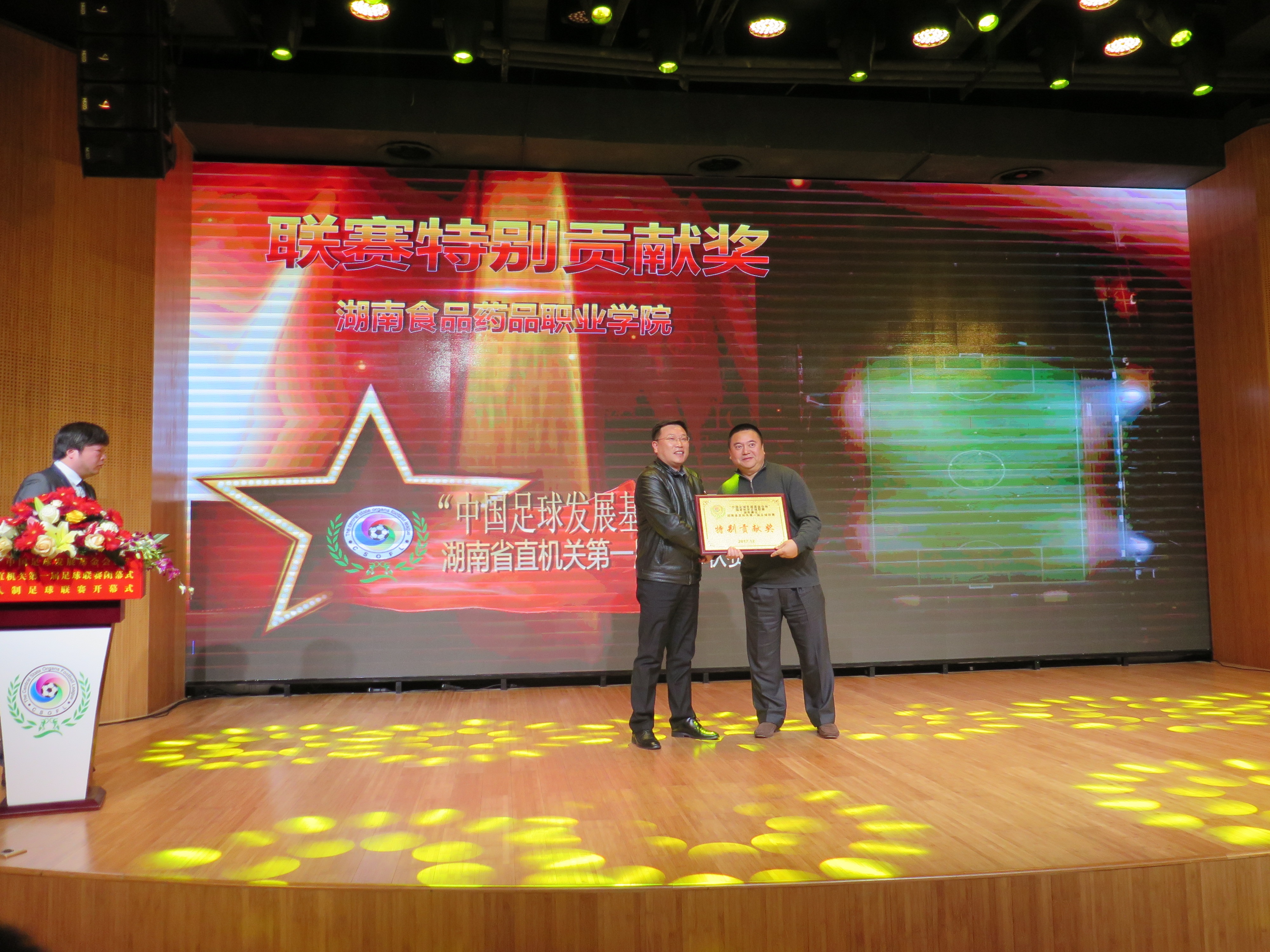 我校党委书记杨文伟出席闭幕式。闭幕式上,大会还颁发了本次联赛相关奖项,湖南省财政厅足球队以15战12胜2平1负,总积分38分的骄人战绩获得本届联赛冠军,湖南省人民政府国有资产监督管理委员会足球队以10个净胜球的优势获得联赛亚军、湖南省卫生和计划生育委员会委足球队获得联赛季军,湖南食品药品职业学院荣获特别贡献奖。本次闭幕式,我校6名组织志愿者作为唯一接待工作人员,参加了本次闭幕式,同时有10名志愿者为闭幕式献上了精彩的啦啦操,充分体现了我校学子良好的综合素质。