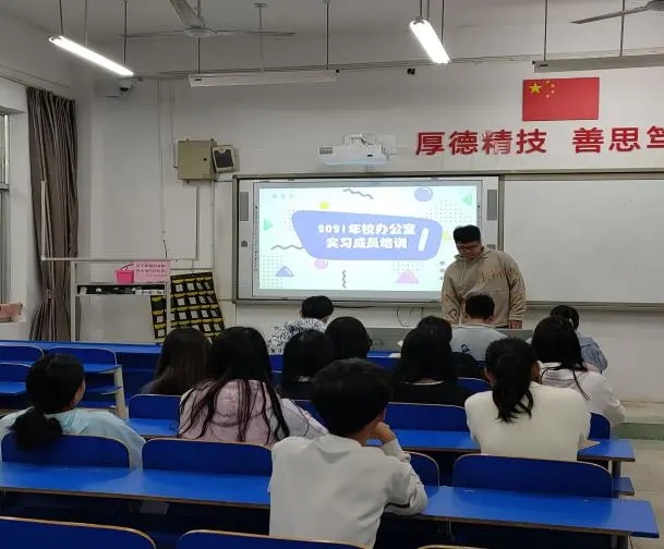 2021年10月12日中午12:30在教109召开了校办公室第一次全体会议,会议由校办公室主任陈壮主持,团委学生副书记胡彬、校办公室三位主任及全体成员参加了本次会议。 会上办公室主任陈壮介绍了办公室的规章制度、日常工作、部门分组和工作要求等,特别强调了在工作时间不能掺杂个人情绪,要增强服务意识。随后请实习成员进行相互认识和了解,明确成员之间、部门之间要团结合作,齐心协力。 本次会议为办公室今后的工作打下了坚实基础,相信校办公室全体成员会像百舸争流的湘江一样为全校师生尽心尽职的服务。