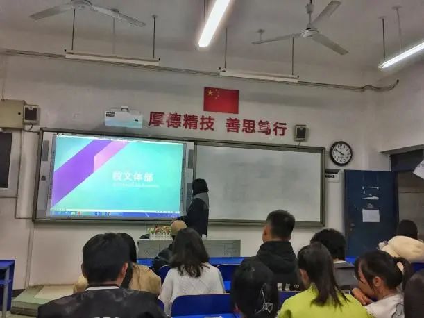 校文体部部长易娟用图片、文字简明地讲述了如何撰写推文,要注重推文的“时、度、效”,多学习公众号的优秀文稿,推陈出新,并对将要举行的第十六届校文化艺术节做了安排,呼吁各位成员加大宣传与沟通,敢于创新,确保活动有序开展。
