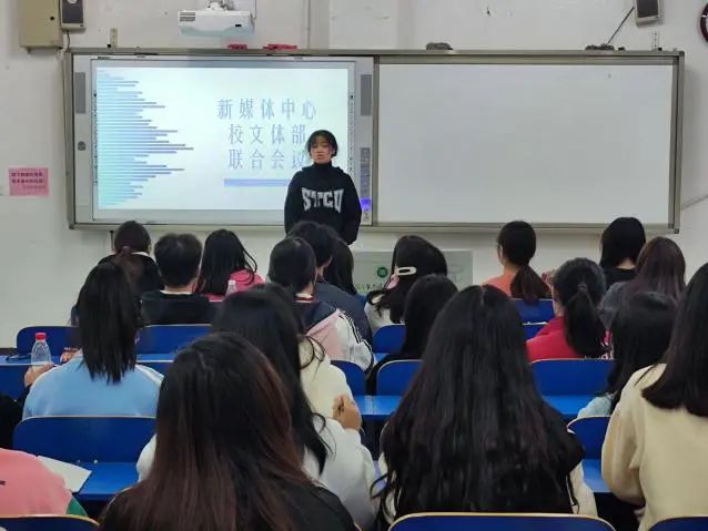 2021年11月19日中午12:40新媒体和校文体部在教学楼112教室开展了全体成员会议。本次会议由新媒体主任陈梦佳和校文体部部长易娟主持,参与此次会议的有新媒体中心三位主任及干事、新媒体中心分管主席、校文体部部长、分管主席以及各部门全体成员。