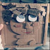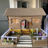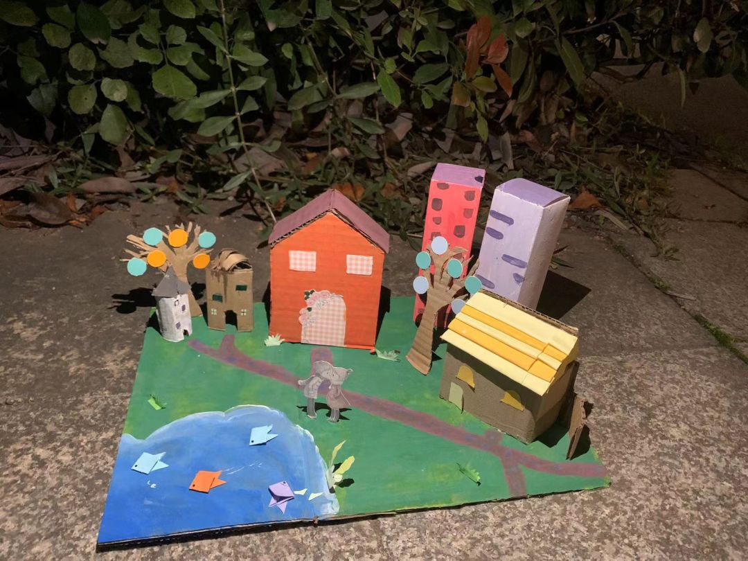 首先我们的作品是由大量的纸箱做成的,名字叫故居,你可以通过图片看到房子和前院的风格不同,意思着过去和未来,时代在进步,我们也在进步,但是不能忘本,牢记使命,不忘初心,方得始终,英勇向前。同时也有怀恋的意思,让这些纸箱发挥到它们最大的价值。