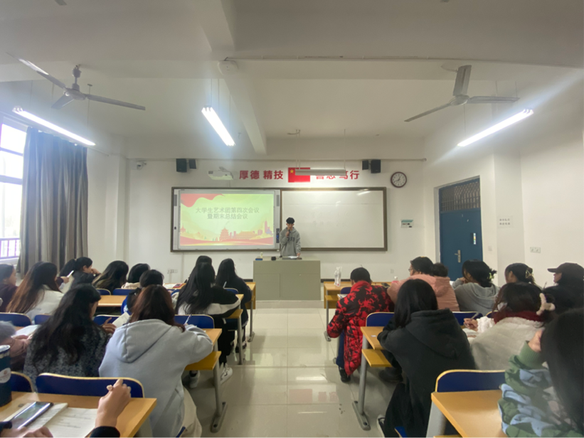 大学生艺术团于12月22日中午12点30分,在阶梯教室101召开了本学期期末总结会议,参加本次会议的人员有校团委彭密老师、艺术团团长王一帆、副团长邓涵坤、刘嘉怡、以及艺术团全体成员。