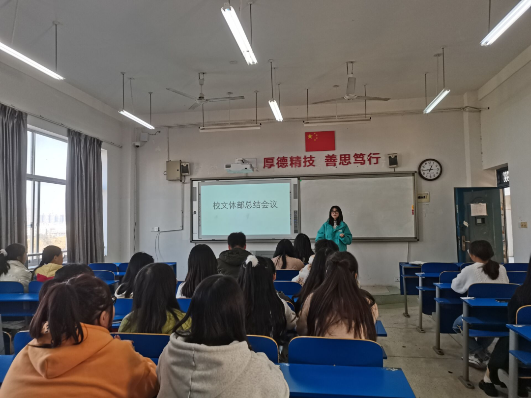 2021年12月23日中午12:40,文体部在教学楼311教室开展了总结会议,本次会议由校文体部部长易娟主持,参与此次例会的有副部长郭卓娴、曾佳以及部门全体成员。