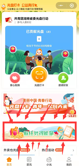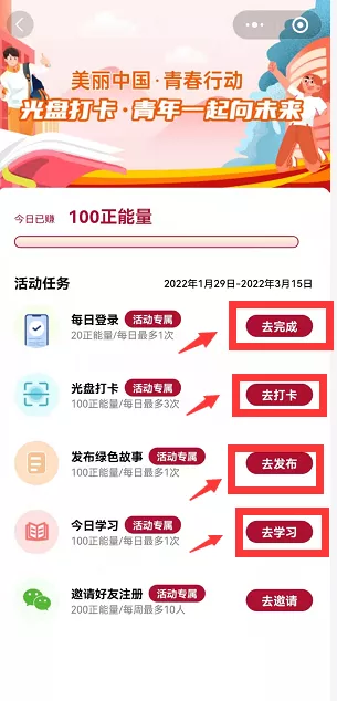 2、光盘打卡:每天完成1次光盘打卡,获得100正能量(每天上限3次)。