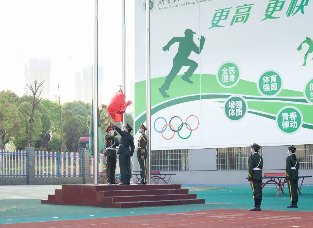 旗手出旗,护旗分列两侧,伴随着雄壮的国歌奏响和一声铿锵豪迈的“敬礼”,鲜艳的五星红旗迎着天空,紧接着《食药风采》奏响,校旗也冉冉升起,全体师生见证了这一庄严肃穆的时刻。