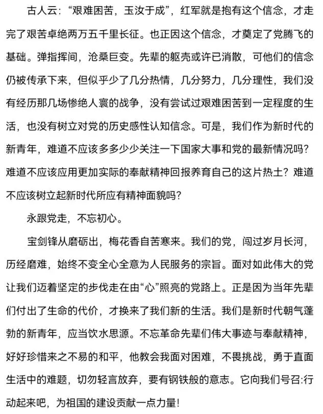 为切实落实“喜迎二十大 永远跟党走 奋进新征程”系列活动,加强食药学子的爱党爱国教育和革命传统教育,激发广大学子读好书、学党史的热情,校团委与校图书馆联合举办了“品读经典,学悟党史,永跟党走”读书征文活动。经过严格细致的评选,初赛由各二级学院评选,精选出14篇作品进入决赛投票阶段。现将作品的部分内容发布如下,请大家踊跃参与,为心目中的最佳征文投上宝贵的一票吧。