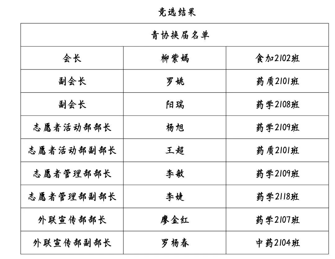 通过校青协各干部推选的竞选人员、资格审查、换届竞选、指导老师、第八届干部和校青协成员的投票四个环节,现确定校青年志愿者协会第九届学生干部名单如下: