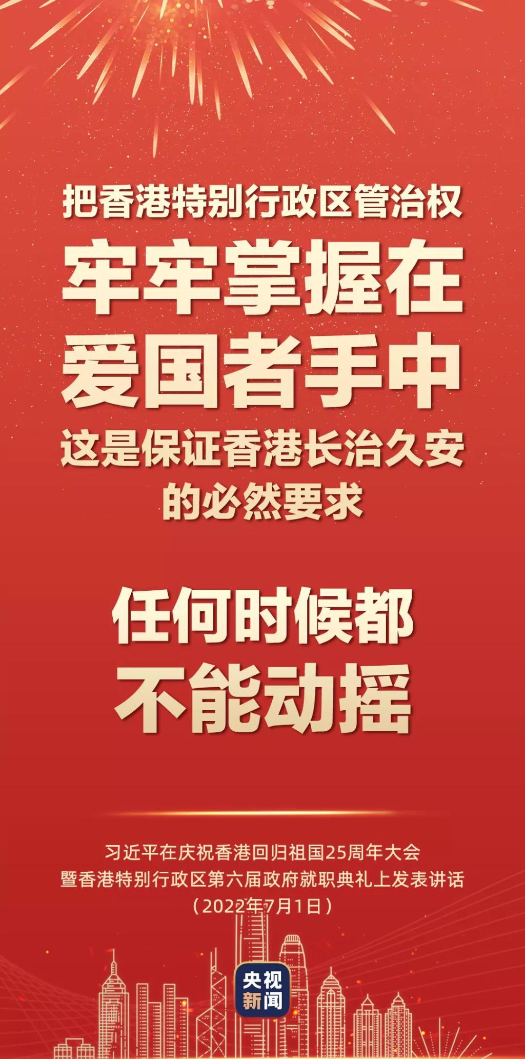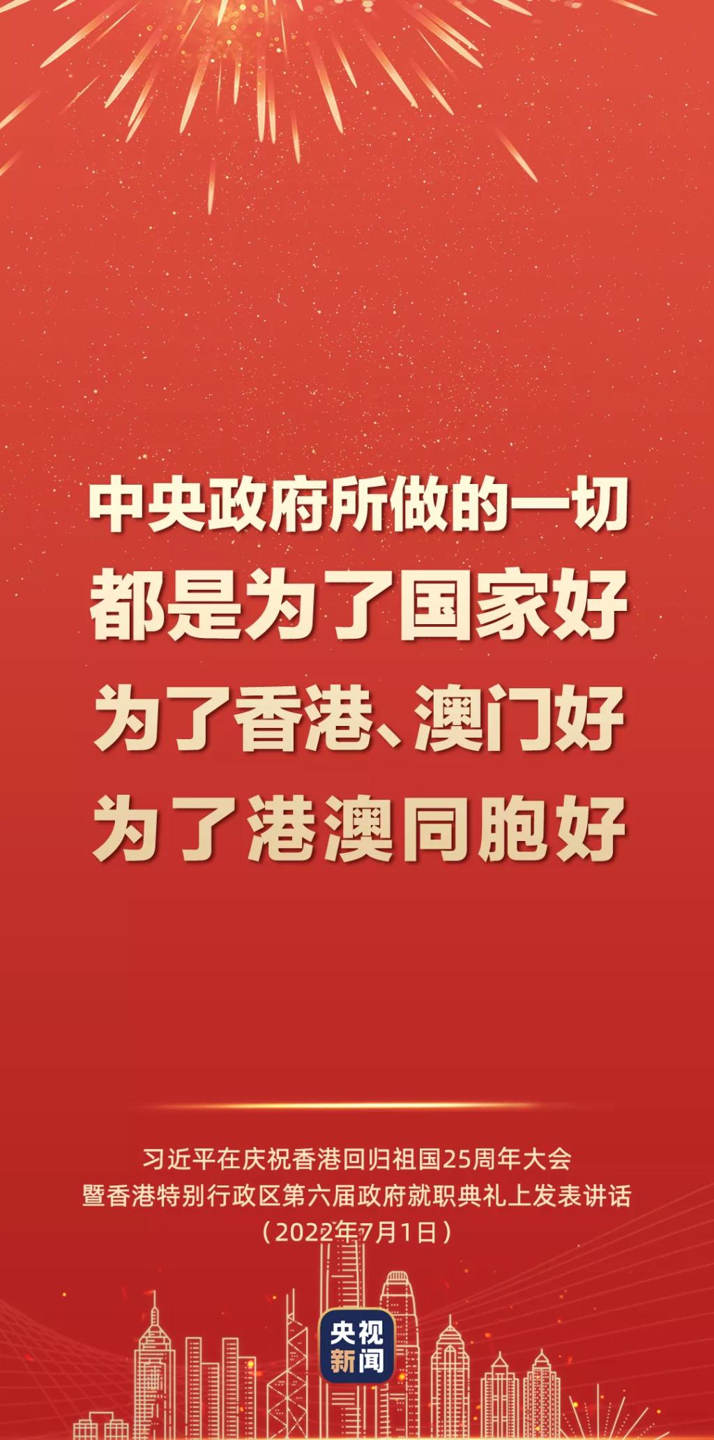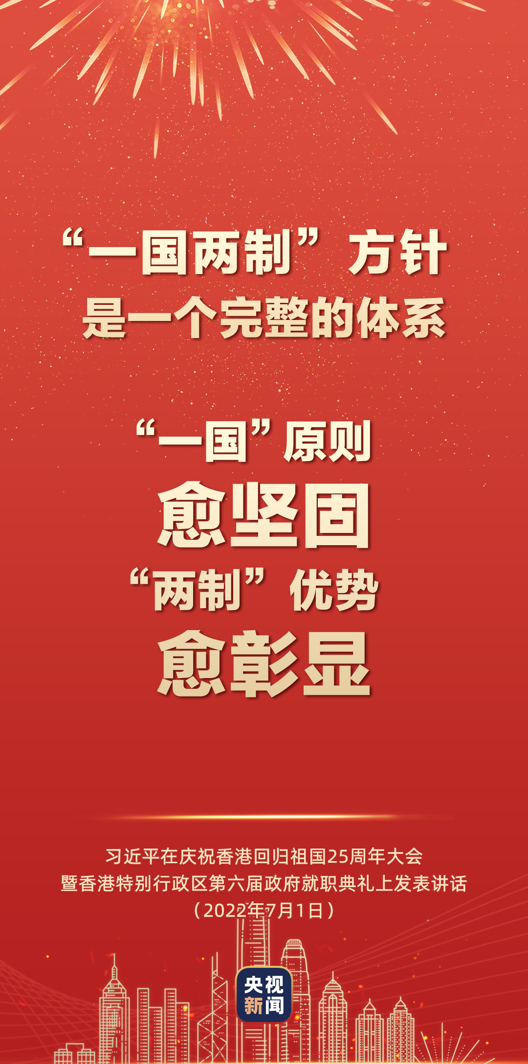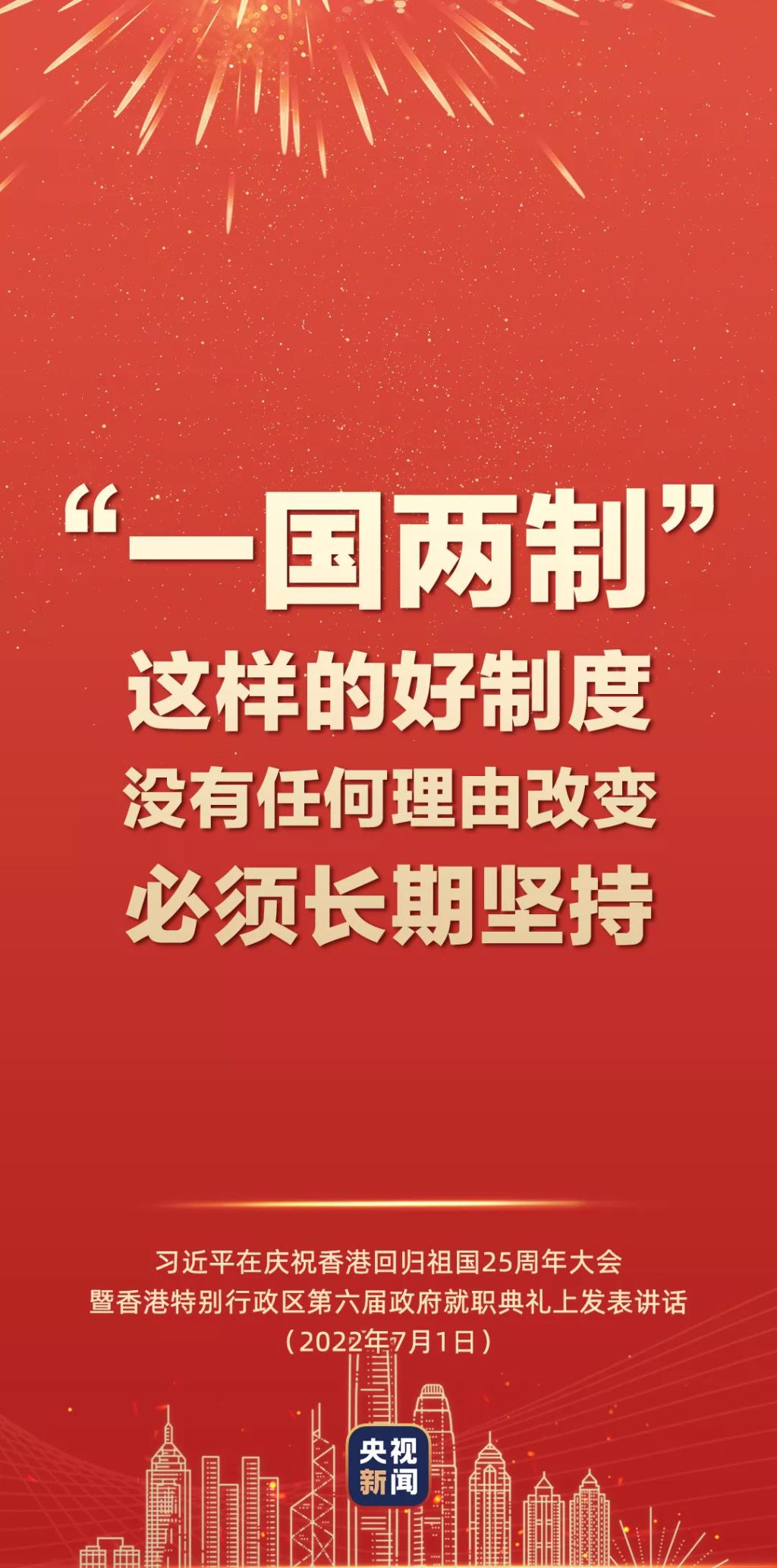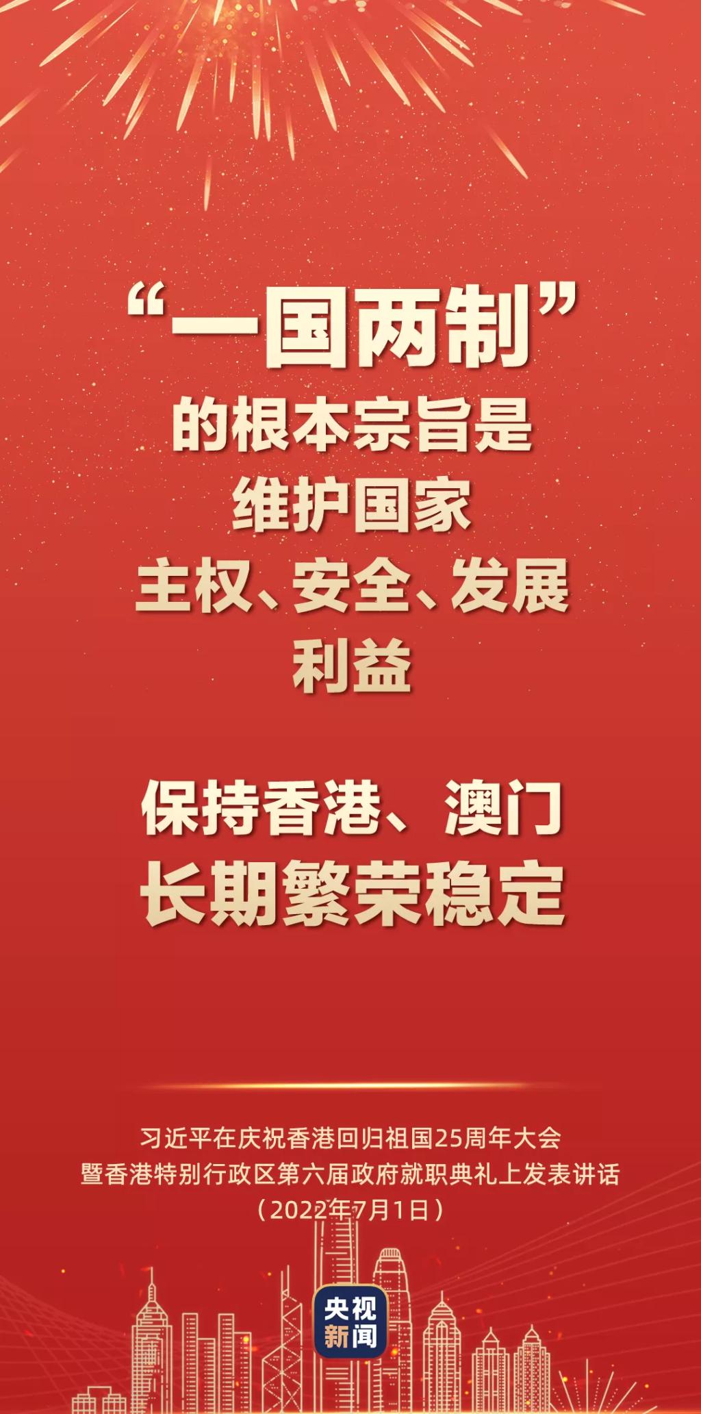 习近平说,在庆祝香港回归祖国20周年大会上,我曾经讲过,中央贯彻“一国两制”方针坚持两点,一是坚定不移,确保不会变、不动摇;二是全面准确,确保不走样、不变形。今天,我要再次强调,“一国两制”是经过实践反复检验了的,符合国家、民族根本利益,符合香港、澳门根本利益,得到14亿多祖国人民鼎力支持,得到香港、澳门居民一致拥护,也得到国际社会普遍赞同。这样的好制度,没有任何理由改变,必须长期坚持!