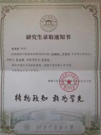 颜倩,湖南食品药品职业学院中药学院2017级中药17304班学生,在湘食药学习期间,在学校及各位老师的帮助下,规划好了自己将来的目标,于2020年通过专升本考试进入湖南中医药大学,并于2022年通过研究生考试被湖中大研究生院录取。