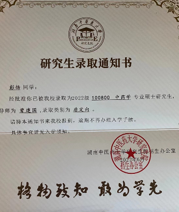 彭扬,湖南食品药品职业学院中药学院2017级中药17302班学生,2020年通过专升本考试进入湖南中医药大学湘杏学院学习,2022年通过研究生考试进入湖南中医药大学。