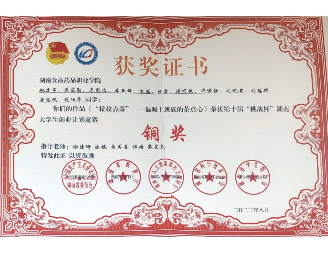 祝贺食品学院姚建军、莫芷勤、李思怡等作品《“啦啦点茶”--温暖上班族的茶点心》荣获第十届“挑战杯”湖南省大学生创业计划竞赛铜奖。