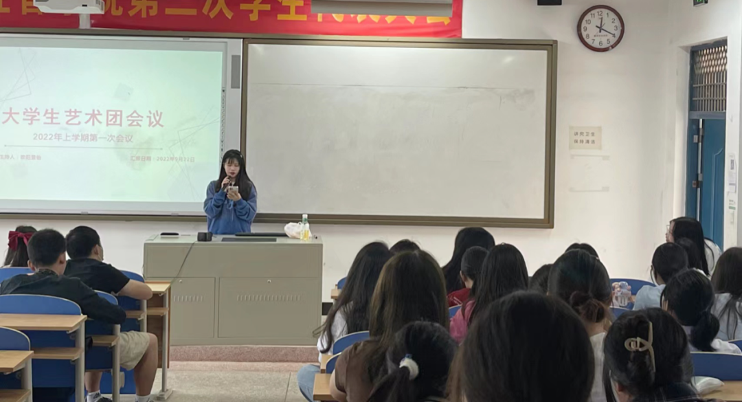 为更好地开展大学生艺术团工作,加强大学生艺术团团内的沟通交流。大学生艺术团于2022年9月22日中午12:15在新实验楼103召开新学期第一次会议。出席本次会议的有艺术团分管主席杨倩,艺术团副团长傅佳钰、欧阳景怡以及全体艺术团成员。 会上副团傅佳钰对新学期工作进行了安排、部署,明确了本学期的工作目标与重心,随后各小组负责人探讨总结,交流未来工作规划与展望,希望每位学员都能以积极进取的态度投入到各项工作中。