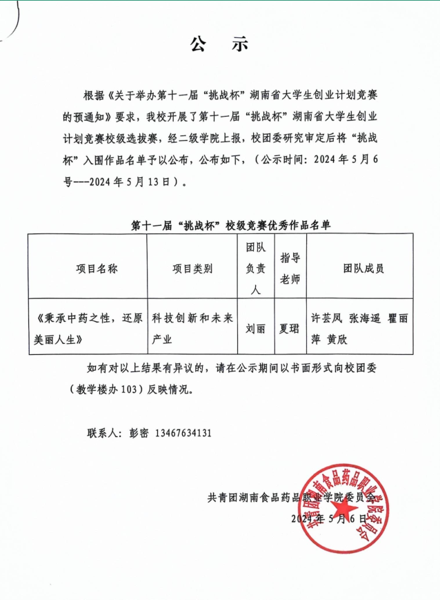 第十一届“挑战杯”湖南省大学生创业计划竞赛校赛参赛项目公示