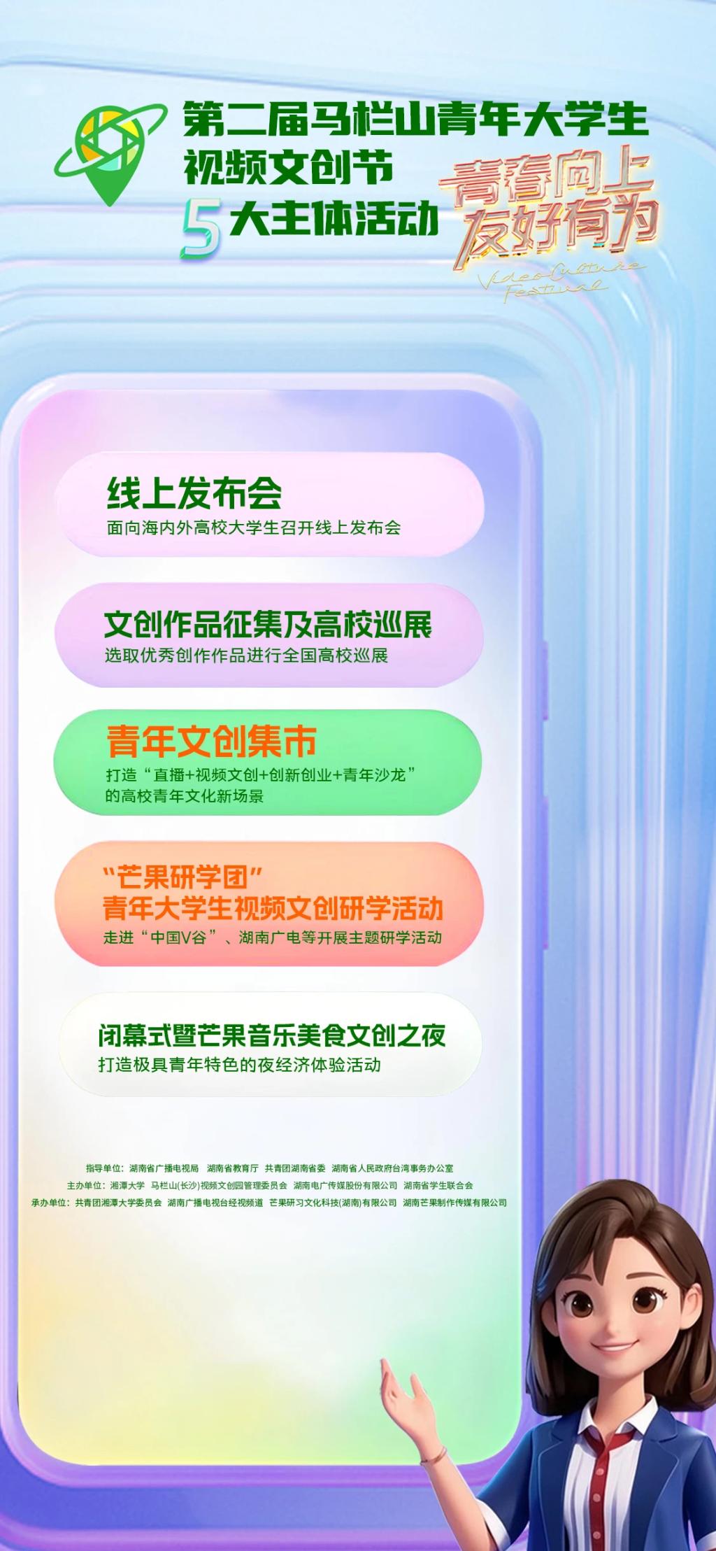 本届马栏山青年大学生视频文创节以“文化+科技”为内核,将高校青年视频文创、短视频、微短剧产业、新媒体平台流量三方资源有机结合,为青年大学生提供集学习实践、交流互鉴、创业就业于一体的平台,激发青年大学生创新潜能,发出青年新声音,向社会呈现新时代青年的思考。