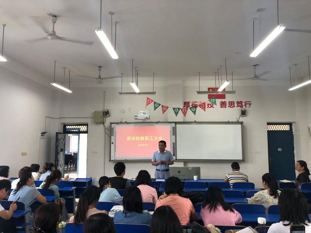 9月11日下午,药学院召开全体教职工工作会议,贯彻落实学校2020年秋季学期开学工作部署会议精神,就疫情防控、秋季学期开学、暑期近期工作等进行研究部署。学院党总支书记陈少华主持会议,院长万能对2020年秋季学期工作进行部署。