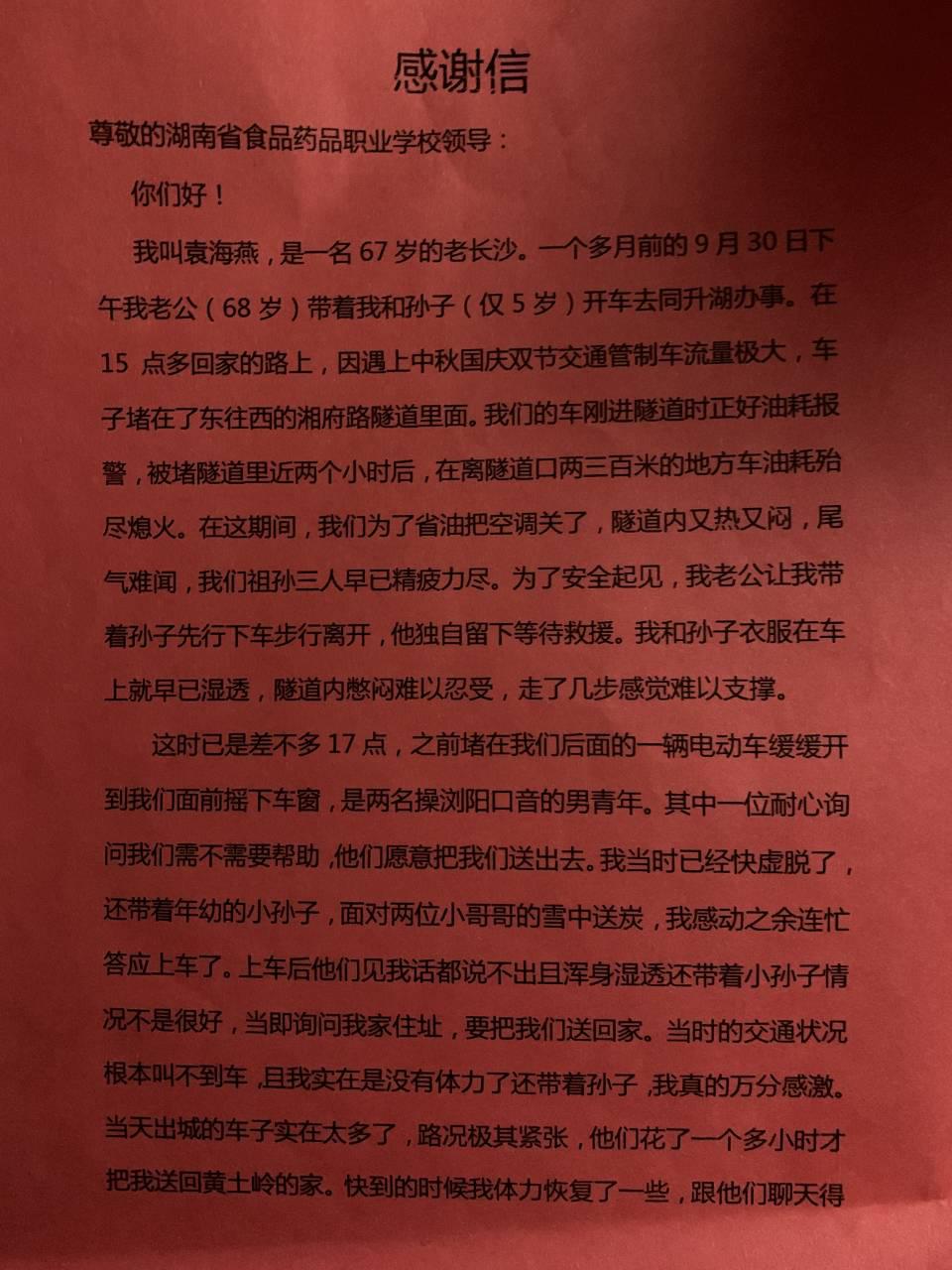 这时已差不多是17点,之前堵在后面的一辆小汽车缓缓开到他们面前摇下车窗,是两位小哥哥他们耐心询问是否需要帮助,面对两位小哥哥的雪中送炭他们夫妻二人感动之余连忙答应上车。两位小哥哥看他们身体情况不是很好当即询问住址,并愿意将他们送回家。当天出城车子实在太多了,花了一个多小时才将他们送回黄土岭的家。在两位老人体力稍微恢复些时,跟热心肠的小哥哥们聊天才得知一个20岁一个19岁,都是湖南食品药品职业学院的学生,并要了他们的联系方式。