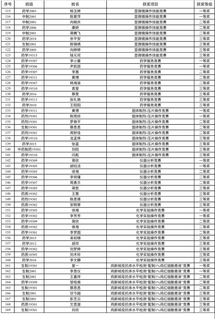 5月11日下午,湖南食品药品职业学院第十七届学生技能节顺利闭幕,本届技能节历时近两个月,我院组织承办了包括化学实验操作、显微镜操作、固体制剂操作、仪器分析、药学服务及鸡新城疫抗体水平检测等在内的六项技能操作竞赛。在学院领导大力支持、各竞赛工作组老师们精心组织下,各赛项从宣传发动、培训、预决赛等各环节均圆满完成。来自全校共计847人次参与了六个赛项的激烈角逐,最终来自药学19309班蒋欣等12人次荣获一等奖,药学19305班徐湘等18人次获二等奖,药剂19301班陈思倩等25人次获三等奖(获奖名单见附件)。