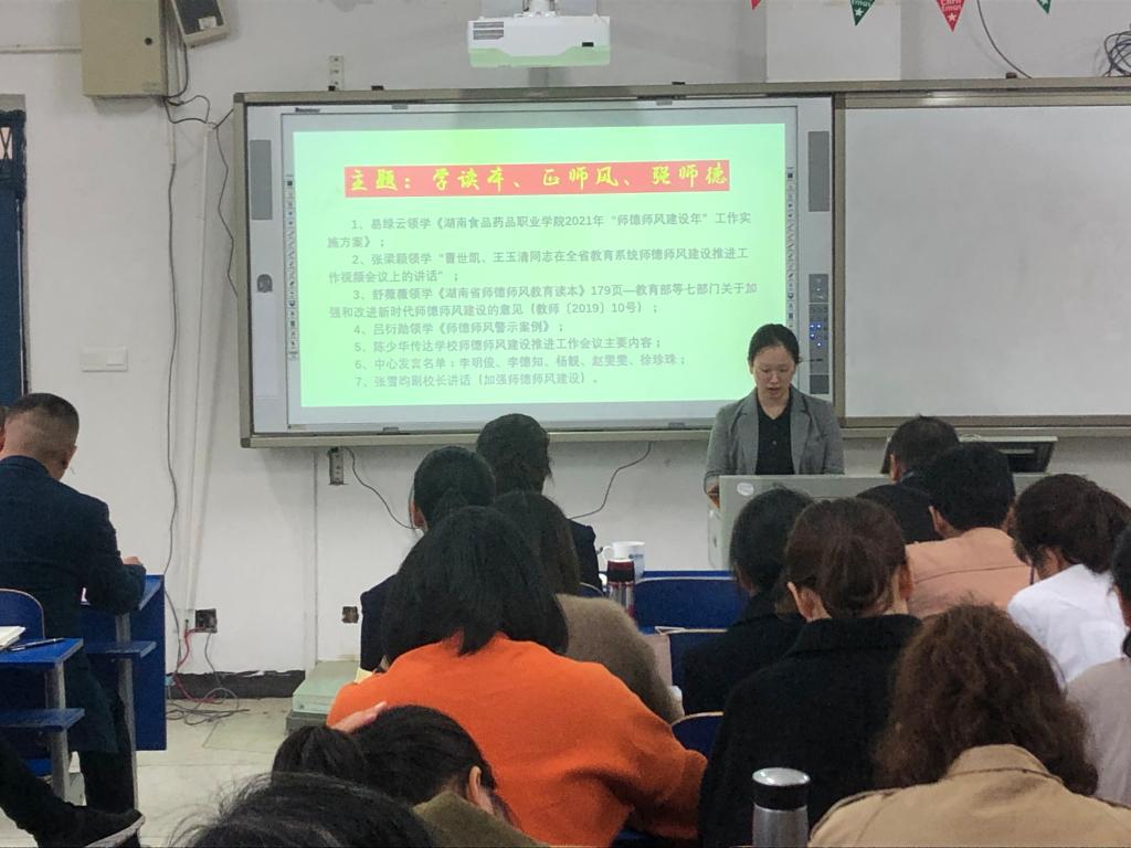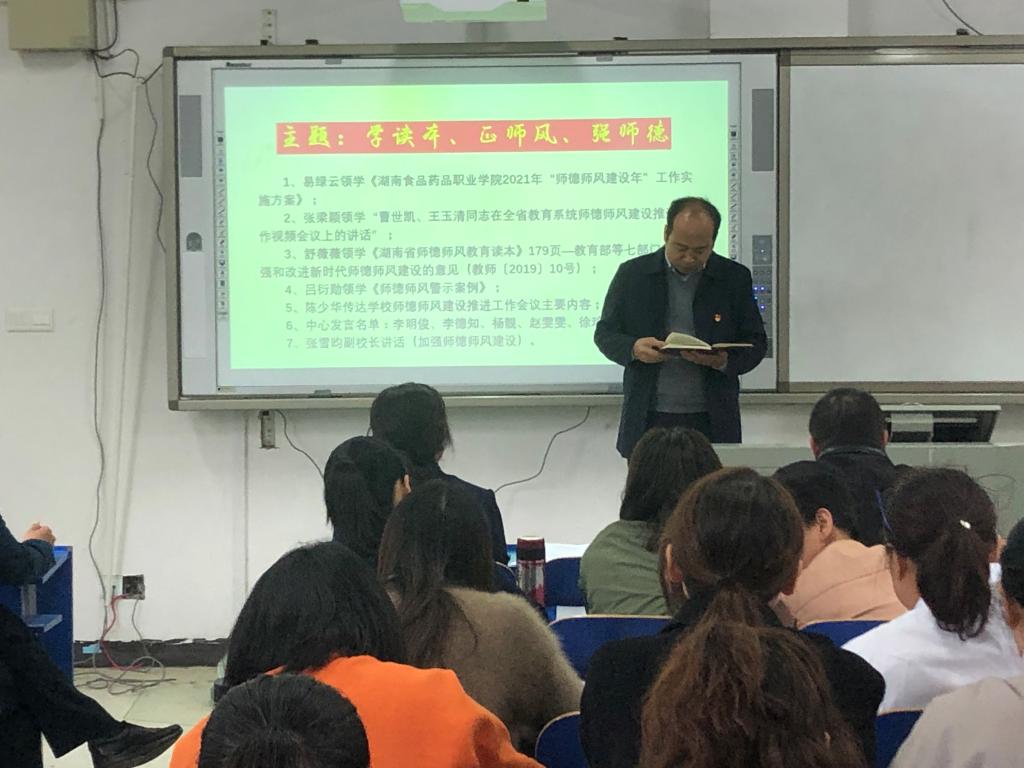 首先,是全体教职工集中学习,易绿云等4名老师领学了《湖南食品药品职业学院2021年“师德师风建设年”工作实施方案》、“曹世凯、王玉清同志在全省教育系统师德师风建设推进工作视频会议上的讲话”、《湖南省师德师风教育读本》179页-教育部等七部门关于加强和改进新时代师德师风建设的意见以及《师德师风警示案例》。随后,陈少华书记传达了学校师德师风建设推进工作会议内容,李明俊等5名党员和教师代表就如何有效落实学校师德师风建设推进工作会议精神,自觉加强师德师风建设作了中心发言。
