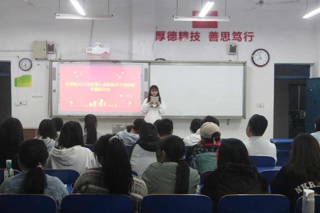 10月28日,药学院党总支在教学楼512教室召开了2021年秋季入党积极分子培训班专题研讨会,药学院全体学员参加此次会议,会议由辅导员赵雯雯老师主持。