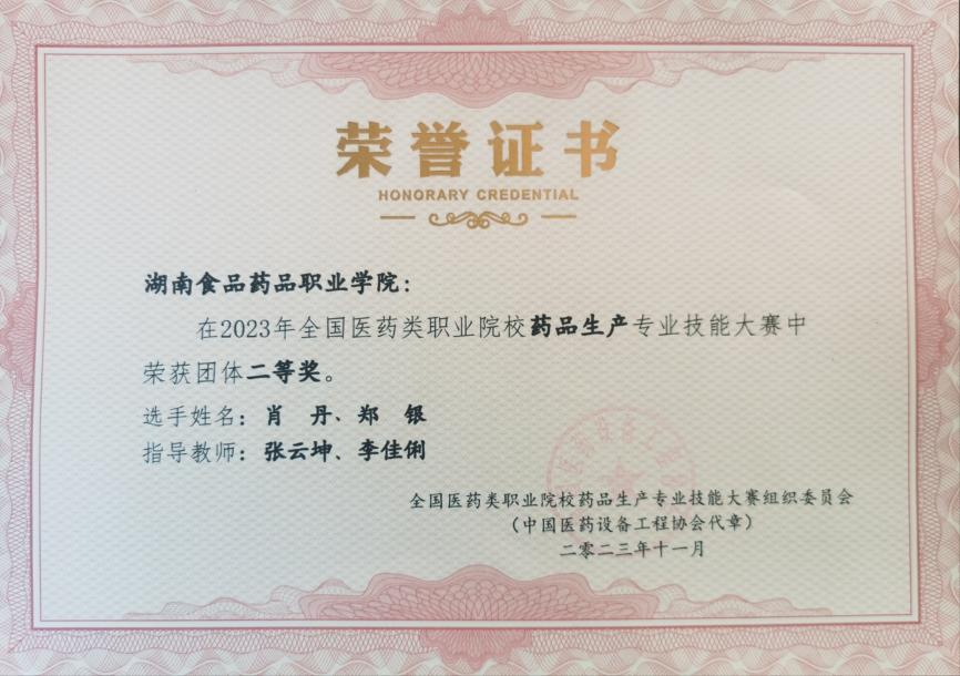 2023年全国医药类职业院校药品生产专业技能大赛于11月20日在江苏淮安落下帷幕,我院药物制剂技术2201班肖丹、郑银两位同学喜获团体二等奖。