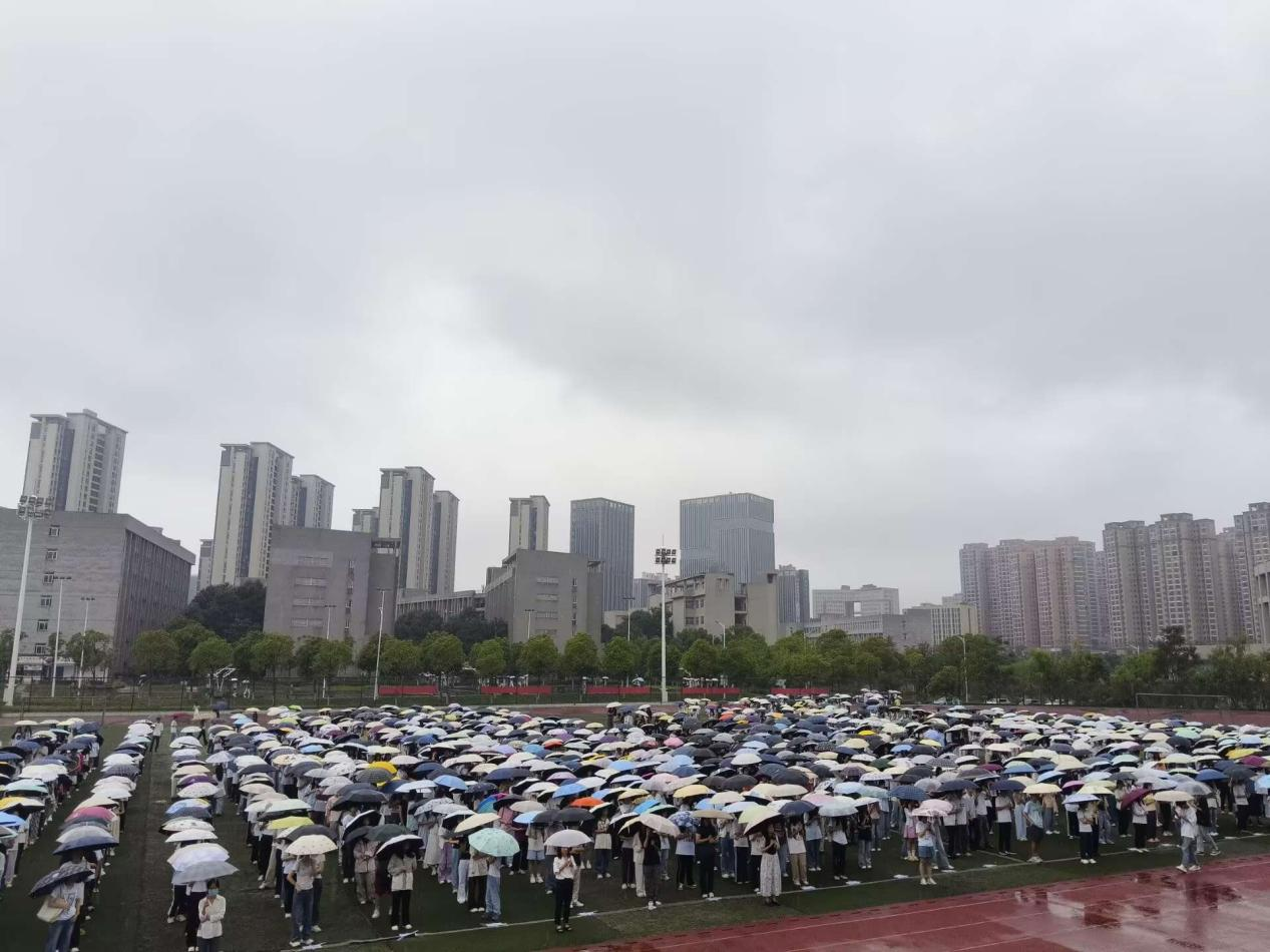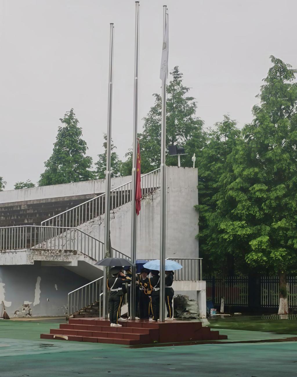 伴随着《国歌》的响起,第一项升国旗仪式正式开始。护旗手们步伐铿锵有力,高擎国旗,在雨中坚定前行。国旗缓缓升起,飘扬在雨幕之中,全体师生庄严肃立,齐唱国歌,歌声嘹亮,饱含着对祖国的无限热爱与忠诚。随后,校旗在《校歌》声中冉冉升起,熟悉的旋律回荡在校园上空,激发着每一位学子的爱校之情。