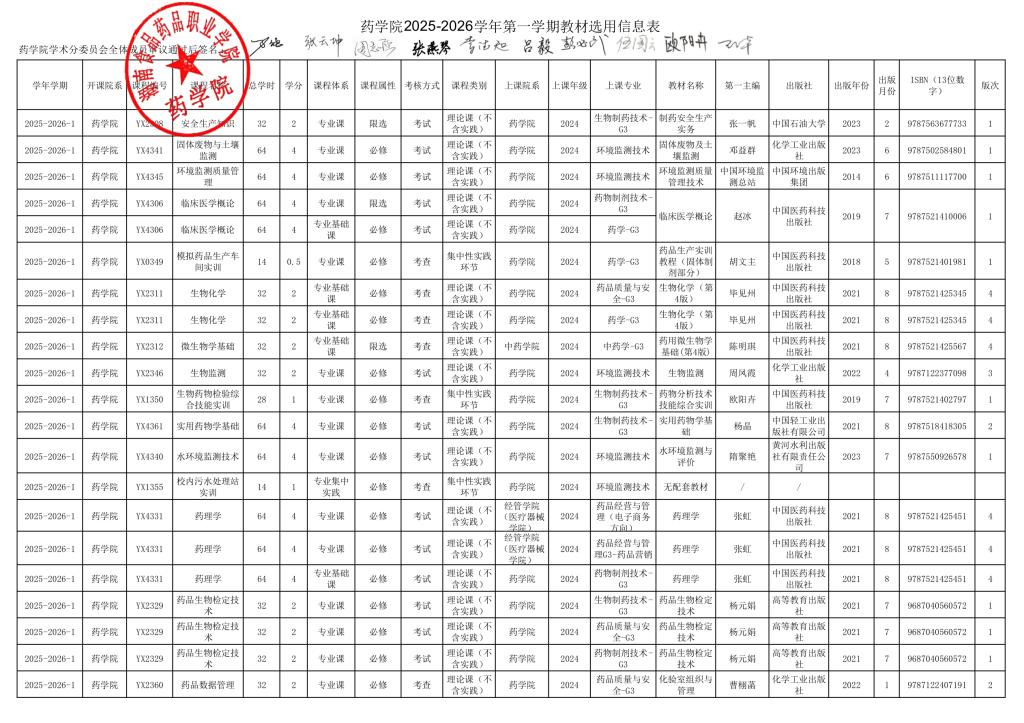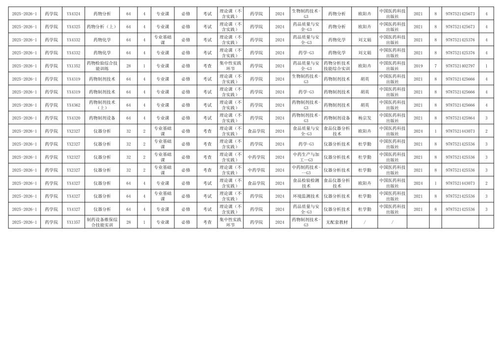 附件:药学院2025-2026年第一学期老生班教材征订计划
