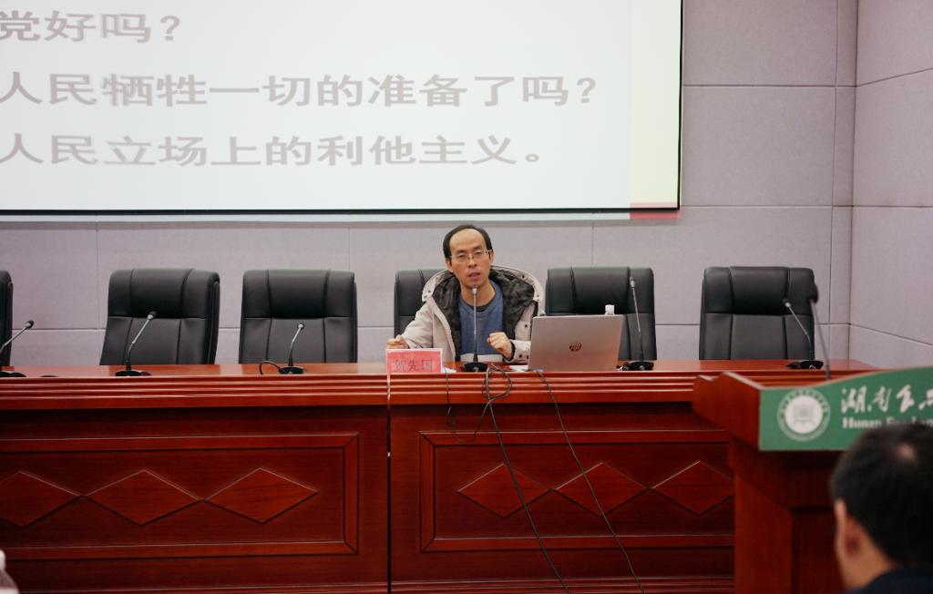2024年12月17日,我校药学院特邀长沙市委党校决策咨询部主任、副教授贺先国教授在我校开展“扎实做好高校基层党支部工作”专题讲座,药学院院长万能、党总支部书记廖跃文等学院领导、药学院党总支全体党员和入党积极分子参加本次讲座,讲座由药学院一支部书记张云坤主持。