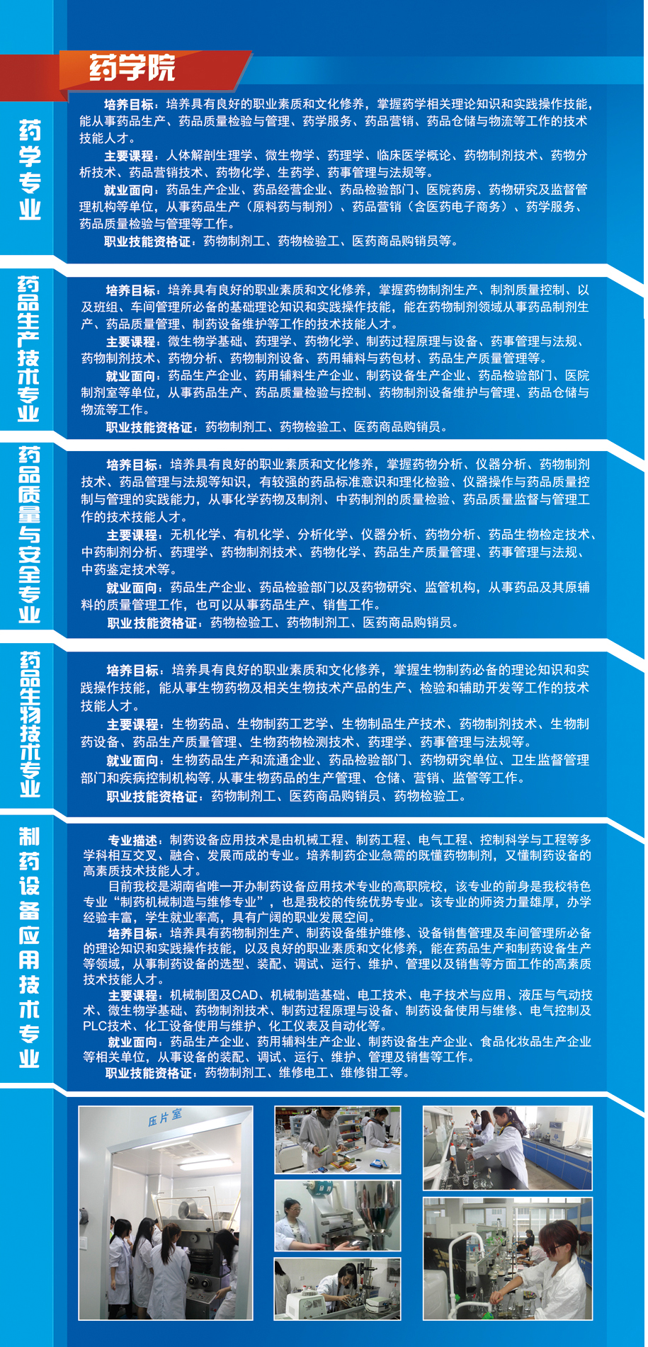 主要课程:人体解剖生理学、微生物学、药理学、临床医学概论、药物制剂技术、药物分析技术、药品营销技术、药物化学、生药学、药事管理与法规等