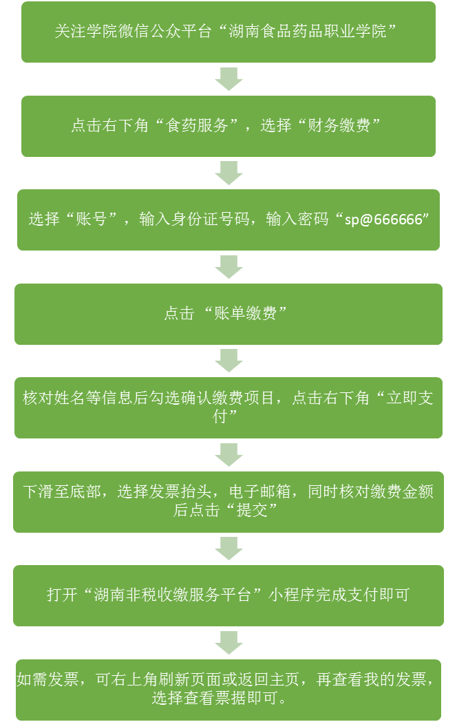缴费方法:关注学院微信公众平台“湖南食品药品职业学院”(hnspypzyxy),点击右下角“食药服务”,选择“财务缴费”,进入“湖南食品药品职业学院收费平台”,进入首页后,选择“账号”,输入身份证号码,输入密码“sp@666666”,进入平台后,点击 “账单缴费”,核对姓名等信息后勾选确认缴费项目,点击右下角“立即支付”(每次最多勾选5 个收费项目),下滑至底部,选择发票抬头,电子邮箱,同时核对缴费金额后点击“提交”(首次需自行增加)。打开“湖南非税收缴服务平台”小程序完成支付即可。如需发票,可右上角刷新页面或返回主页,等待几分钟后,再查看我的发票,选择查看票据即可。