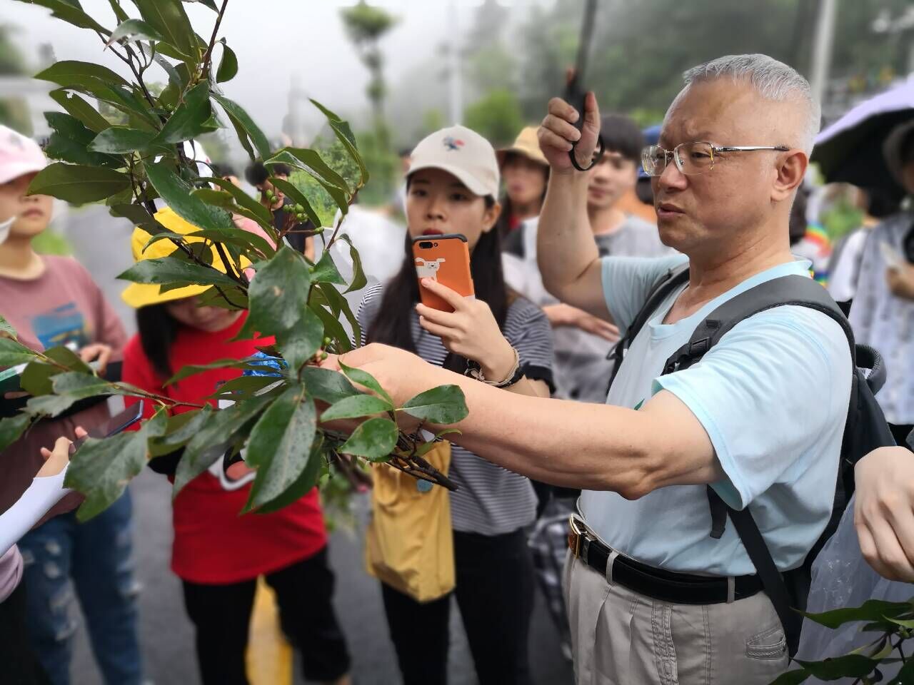 大围山上仙雾缥缈,清新的空气让我们神清气爽,林祁教授,林云等八位老师,带着各自的小分队,沿着昨天踩点的路线,对一路上的植物进行讲解,常见的药用植物的名称、目科属种、形态特征等,让我们对要用植物有了很深刻的认识,见到了只能在课本书上学习到的植物。
